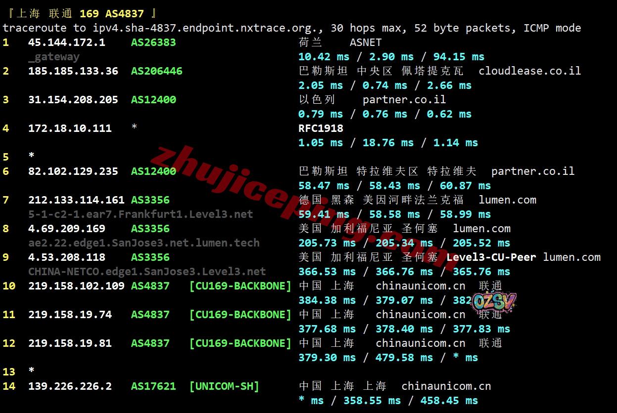 上海方向:走partner.co.il接lumen到德国然后去美国圣何塞,从联通圣何塞peer/lumen回国