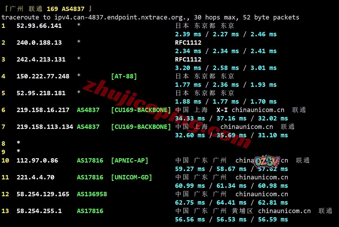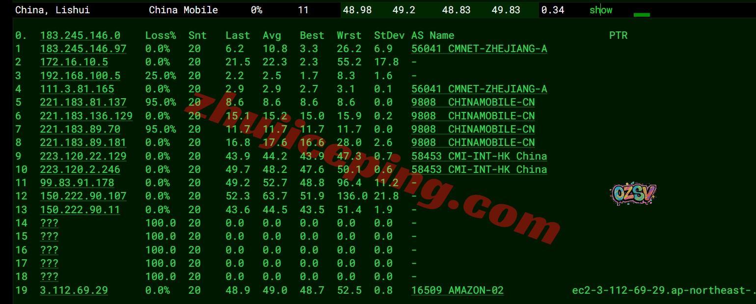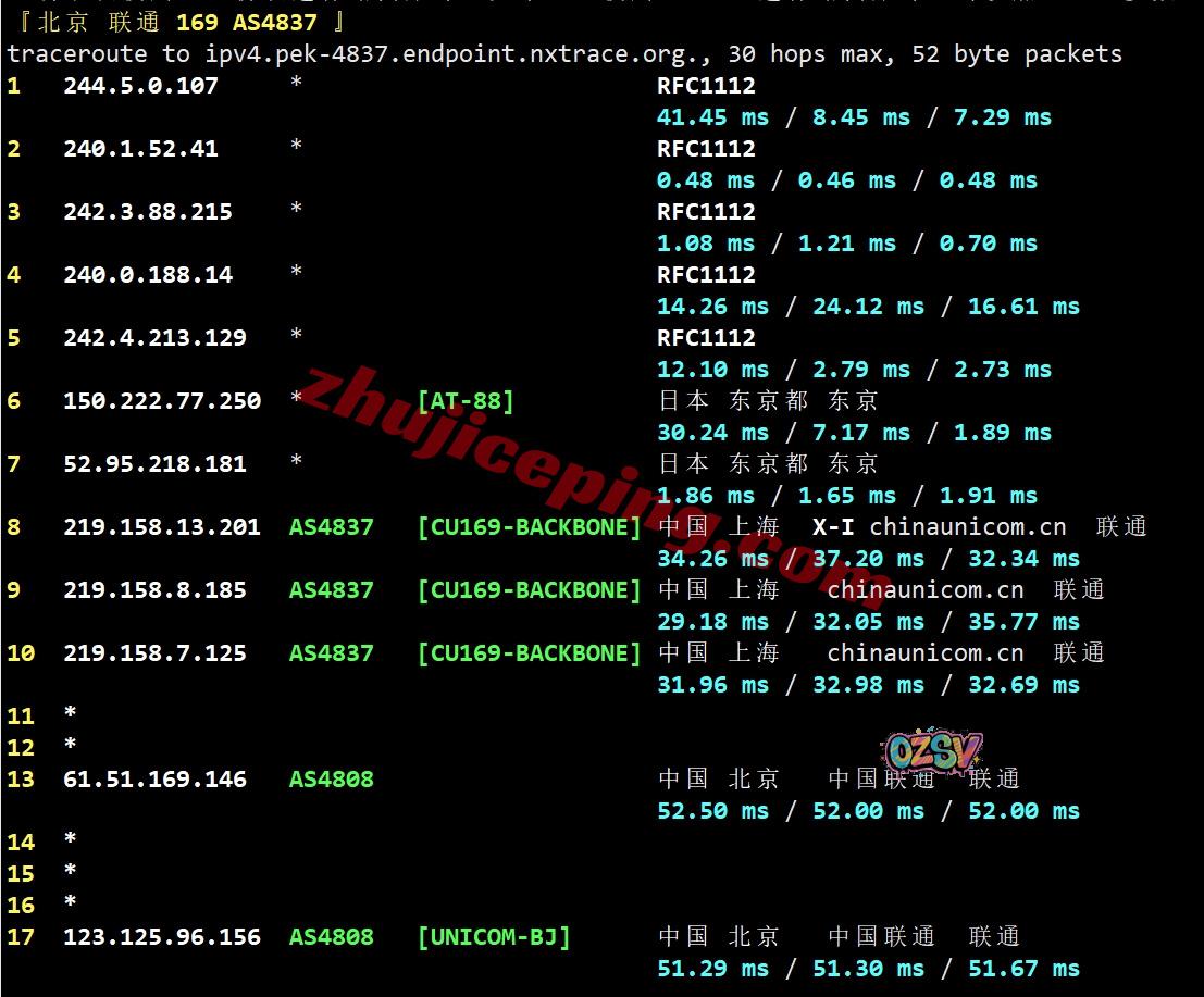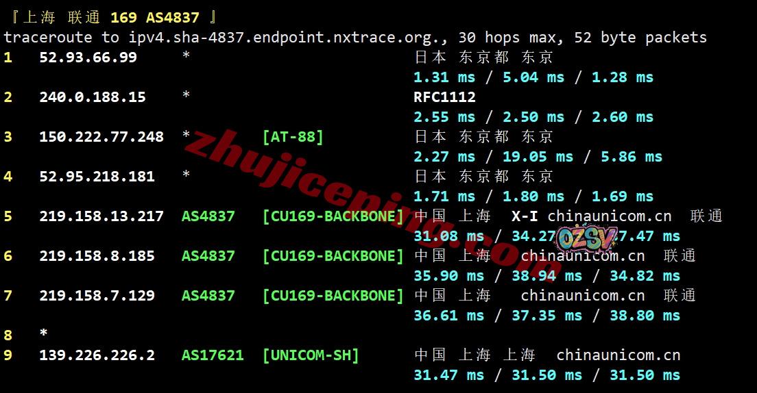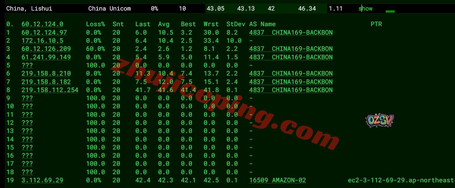 联通回程:从亚马逊日本网络出海回国,延迟非常低
