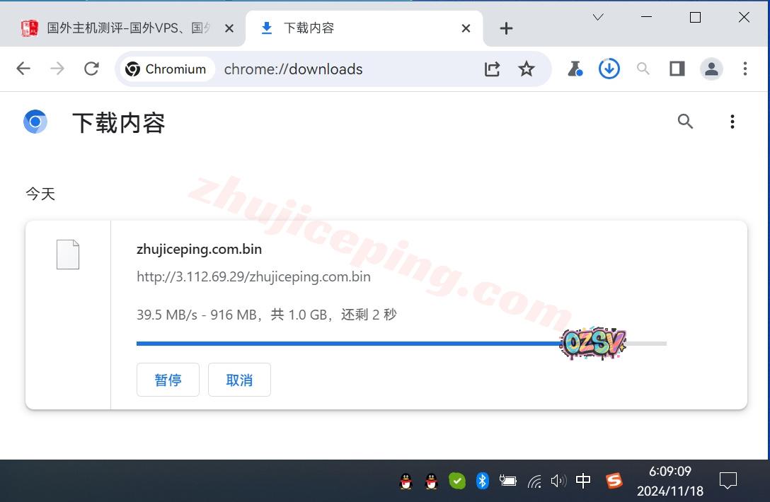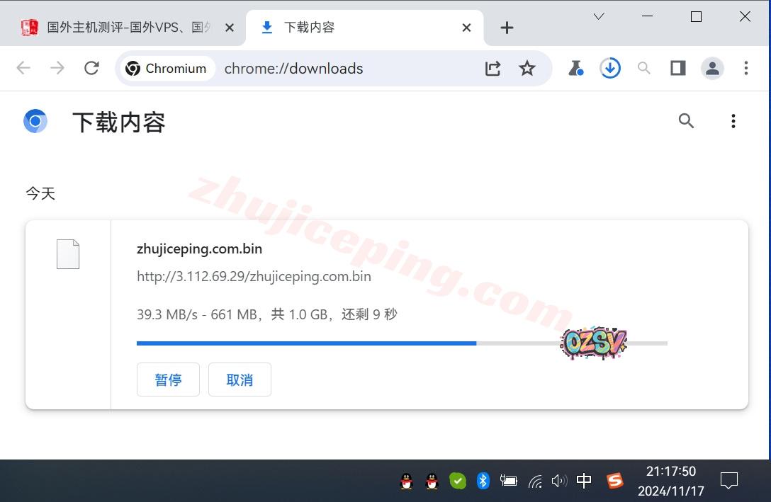 存放在测试云服务器上的文件,广州联通家宽直接用Chrome下载该文件,大致的下载速度如下所示: