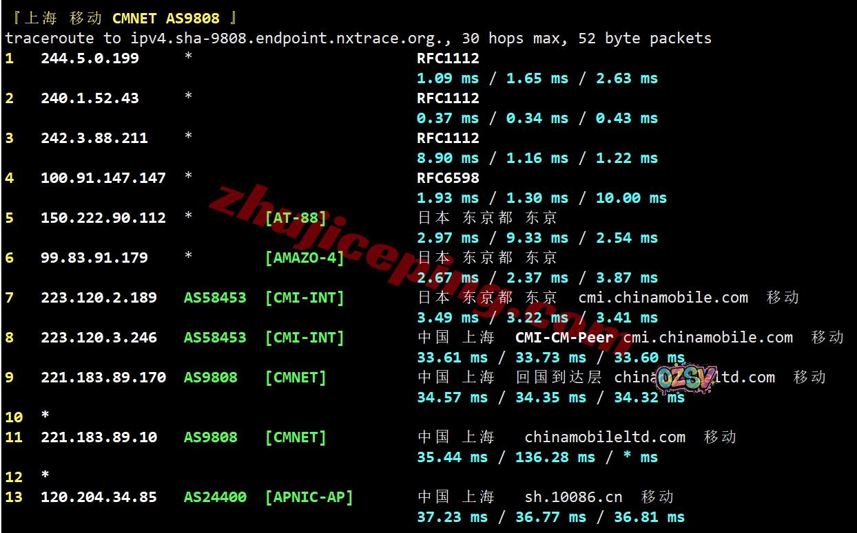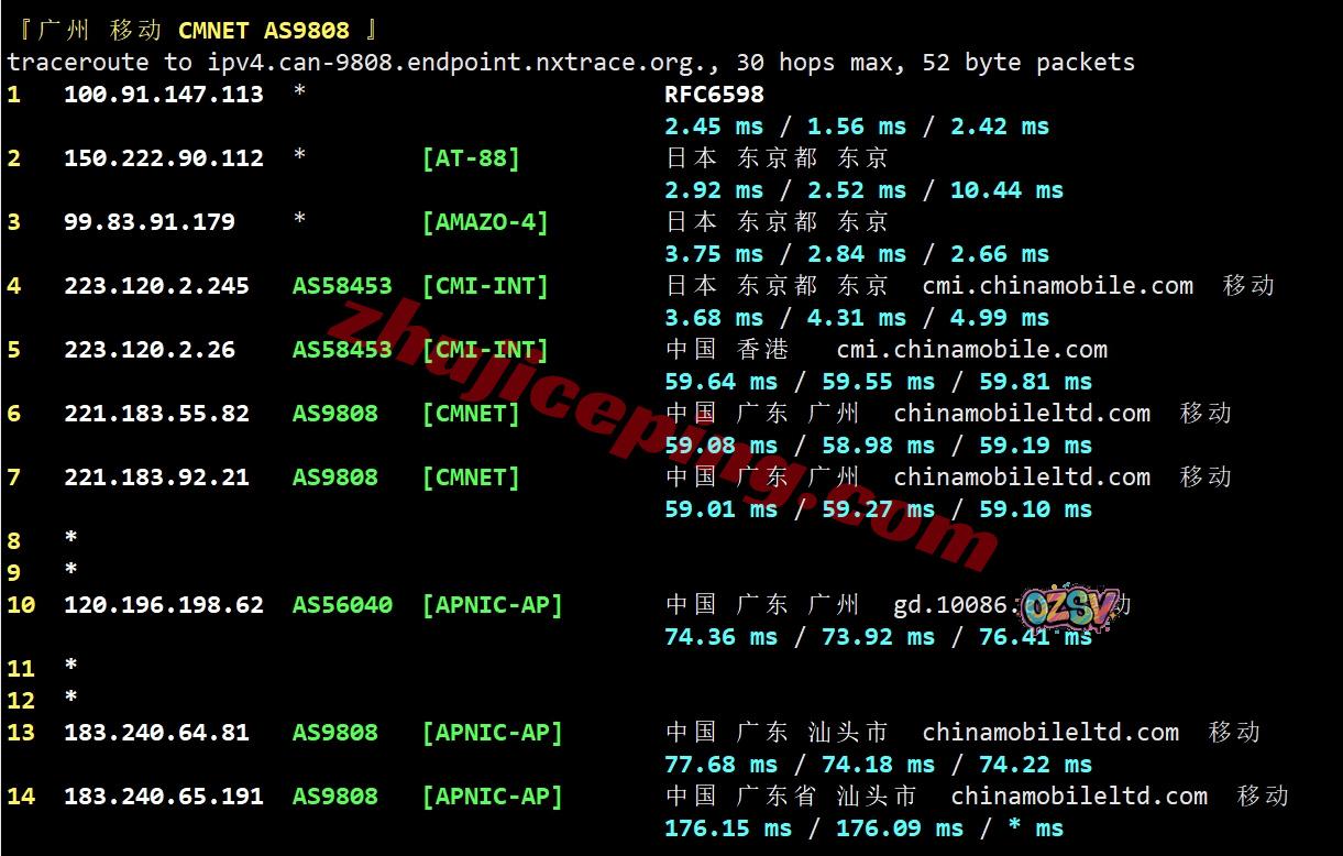 移动去程:直连移动日本东京节点,然后接亚马逊的网络