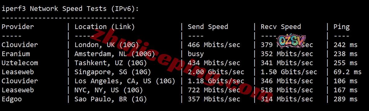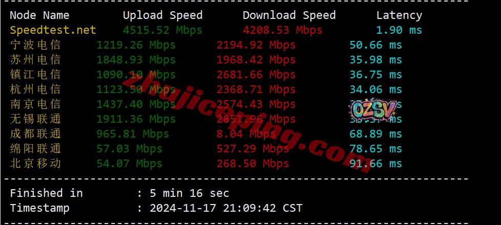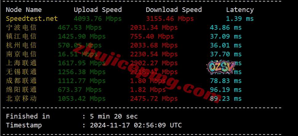 再对比看看在晚高峰期间国内三网不同节点的带宽上下行测试数据: