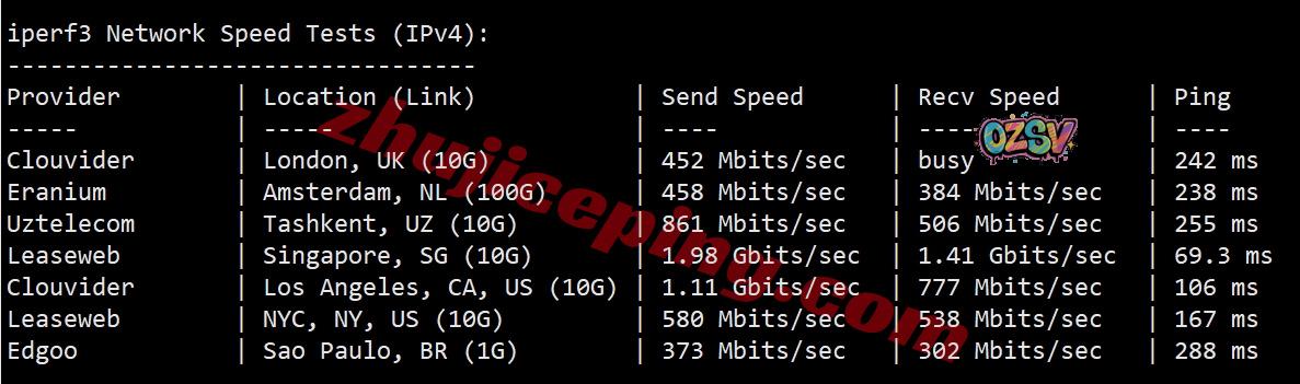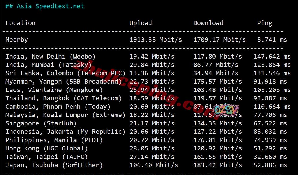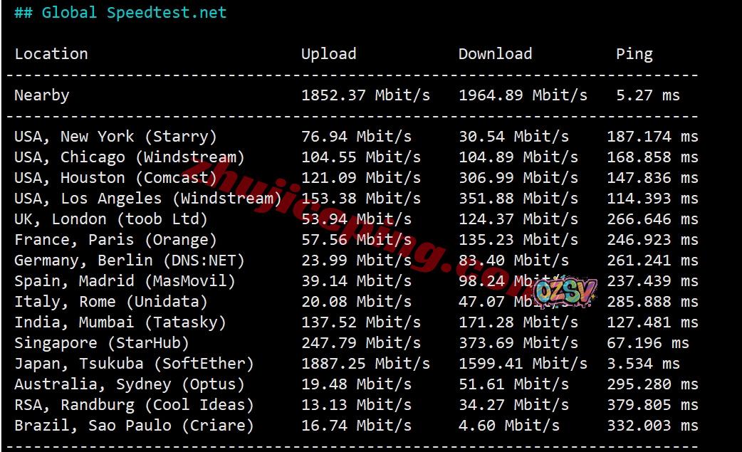 speedtest.Net的部分国际节点的带宽上下行测试数据: