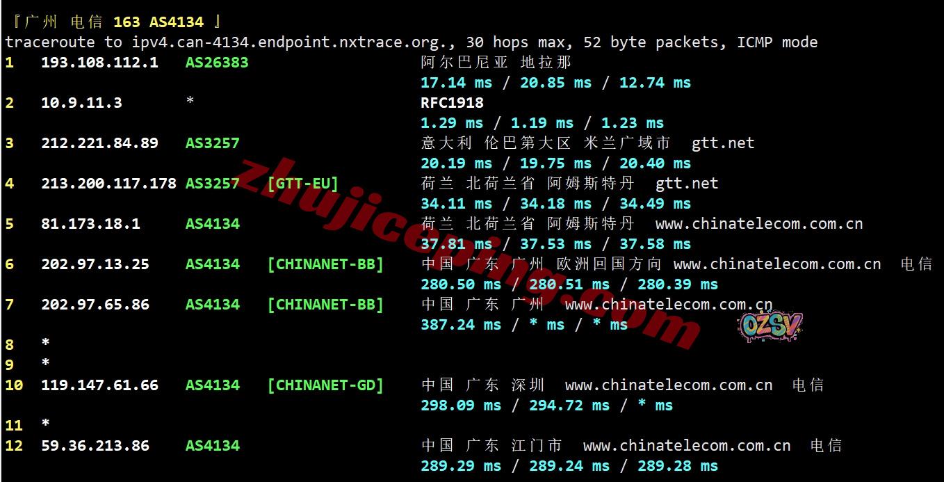 电信回程:走GTT经过意大利、荷兰,从电信阿姆斯特丹节点直连回国