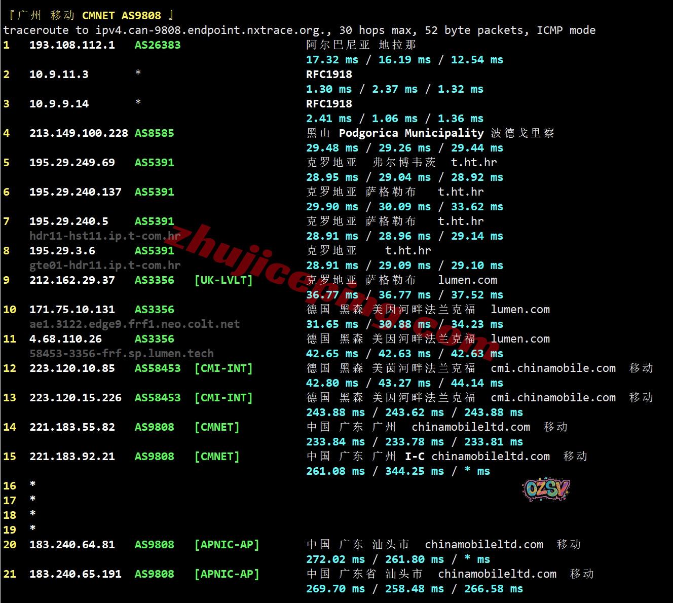 广州方向:走走内网去黑山接ht.hr经过克罗地亚接level3去德国,然后从移动法兰克福CMI节点直连回国