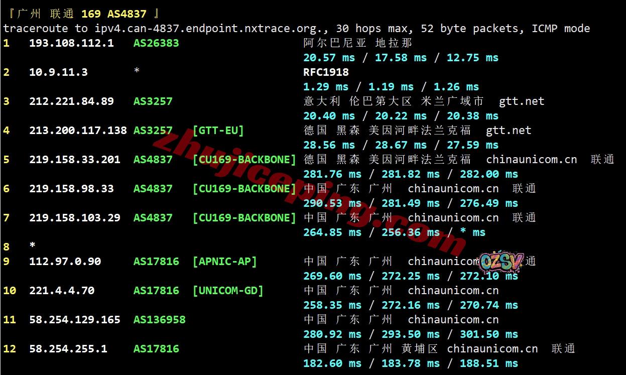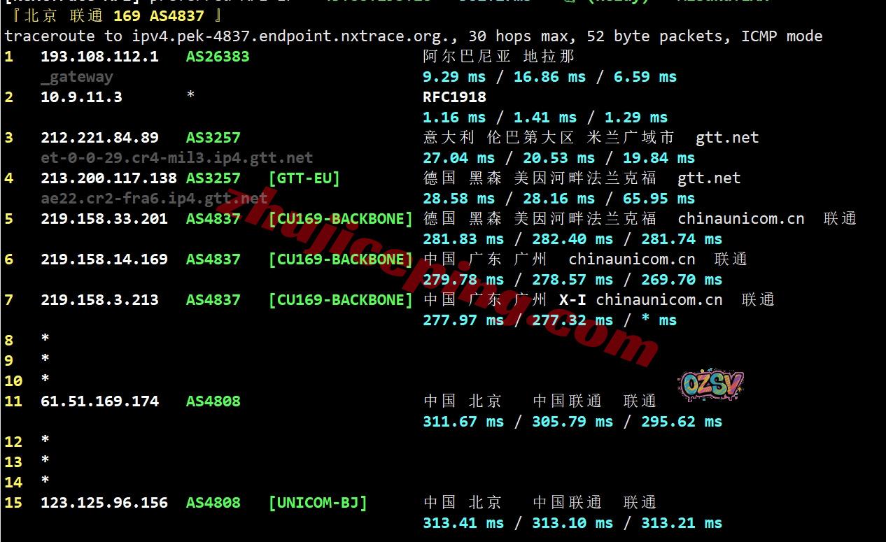 联通回程:走GTT经过意大利去德国,从联通法兰克福节点直连回国