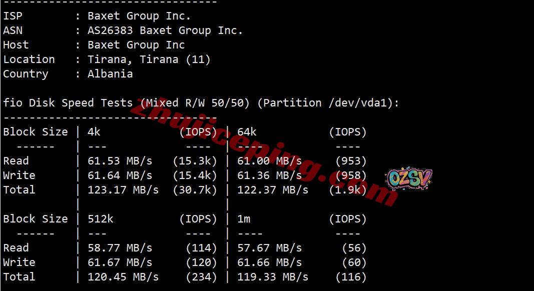 服务器用的CPU型号为e5-2680v4(一般双路,28核、56线程),底层KVM,启用了BBR,支持IPv6,自己家的AS26383,归属地Tirana(阿尔巴尼亚的地拉那),当前I/O大致测试为61.9MB/S:
