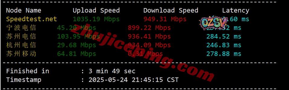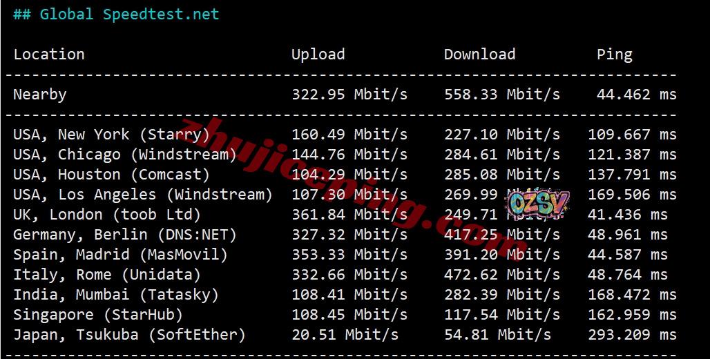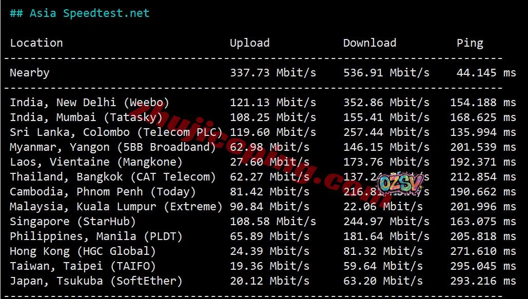 speedtest.Net的部分亚洲节点的带宽上下行测试数据: