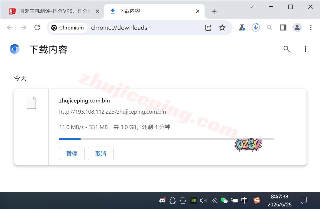 存放在测试VPS上的文件,广州联通家宽直接用Chrome下载该文件,大致的下载速度如下: