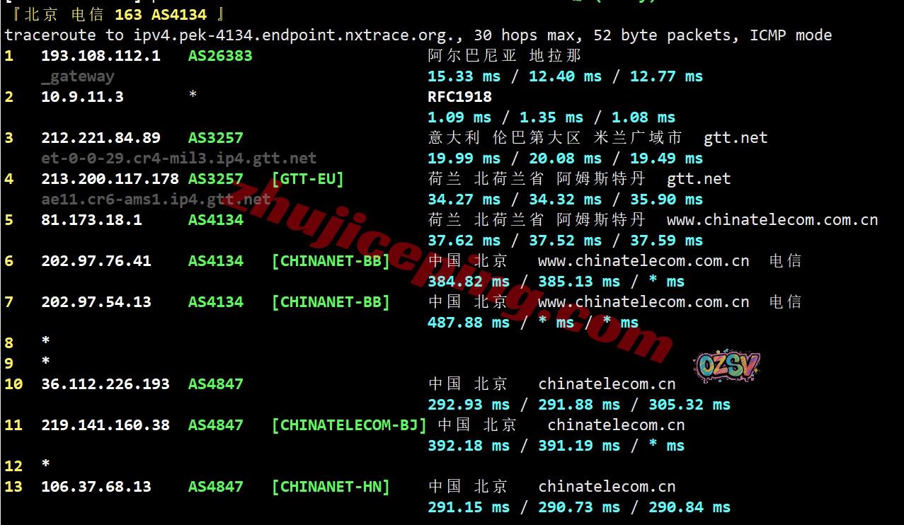 电信去程:直连电信美国圣何塞节点然后接cogent从美国东海岸出海去巴黎、意大利、阿尔巴尼亚