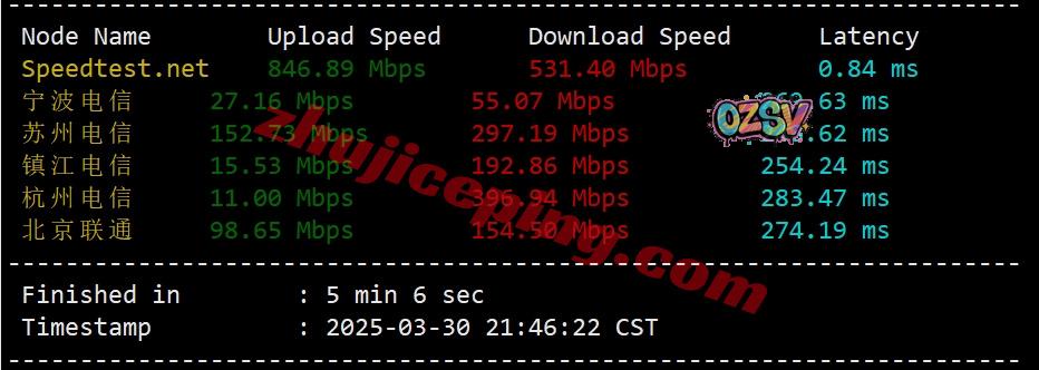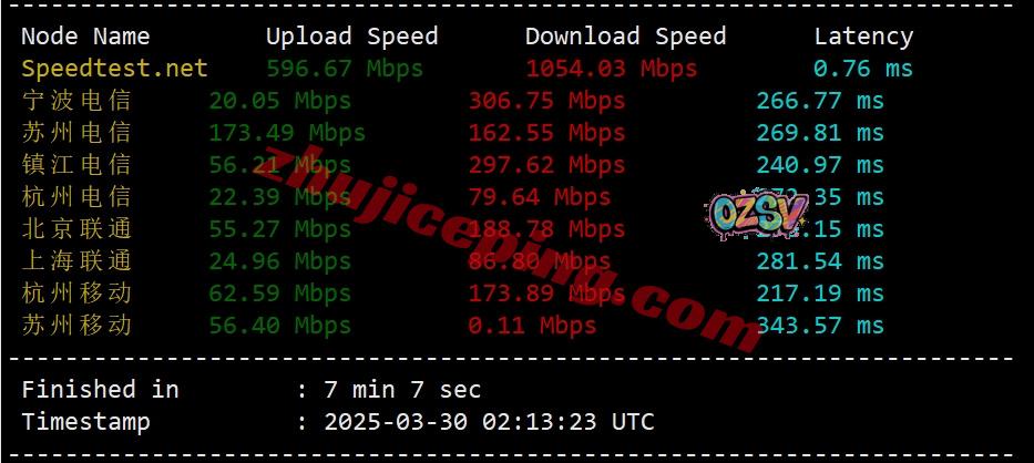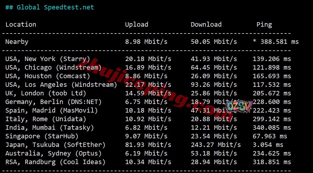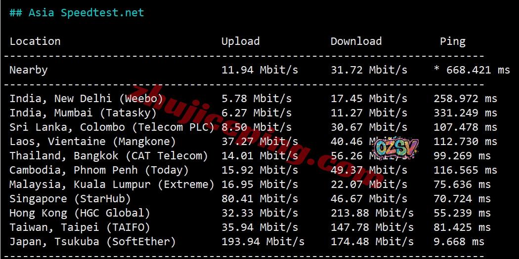 speedtest.Net的亚洲区域内的节点的带宽上下行测试数据: