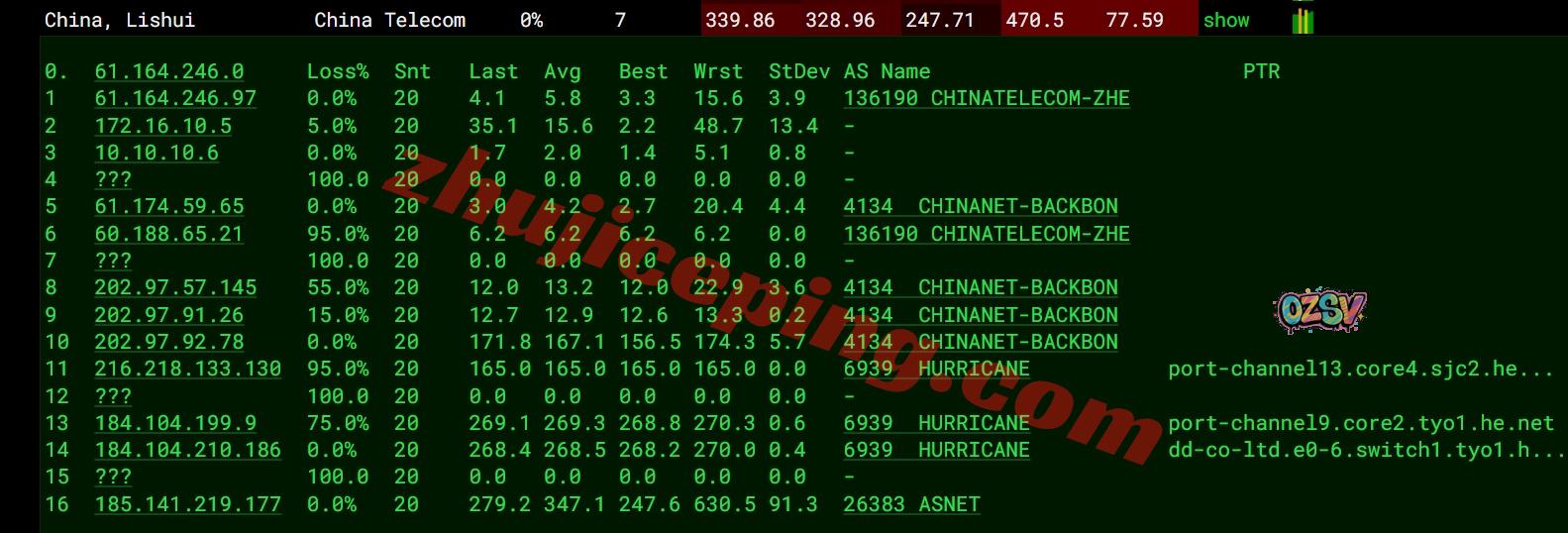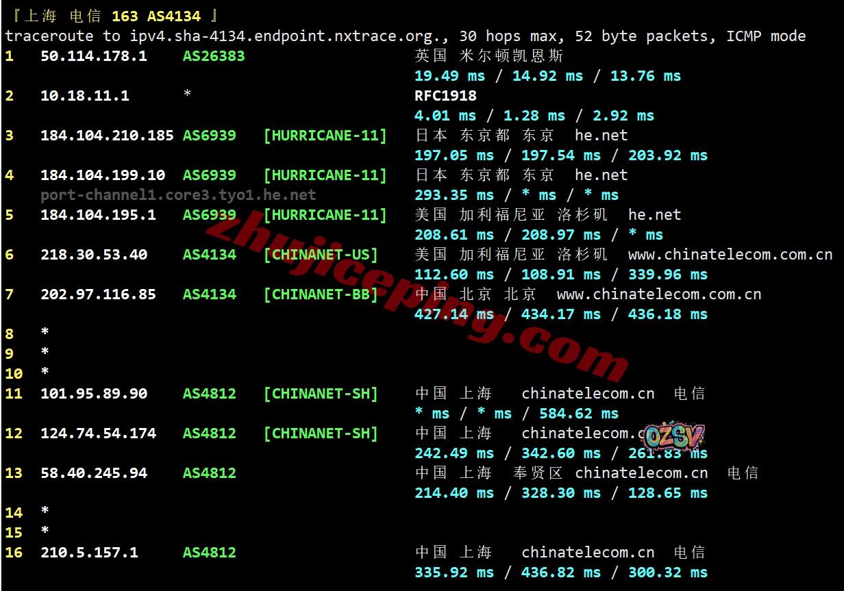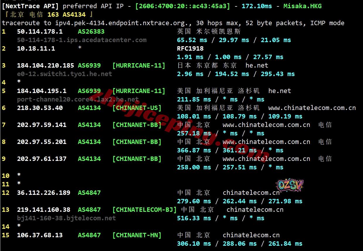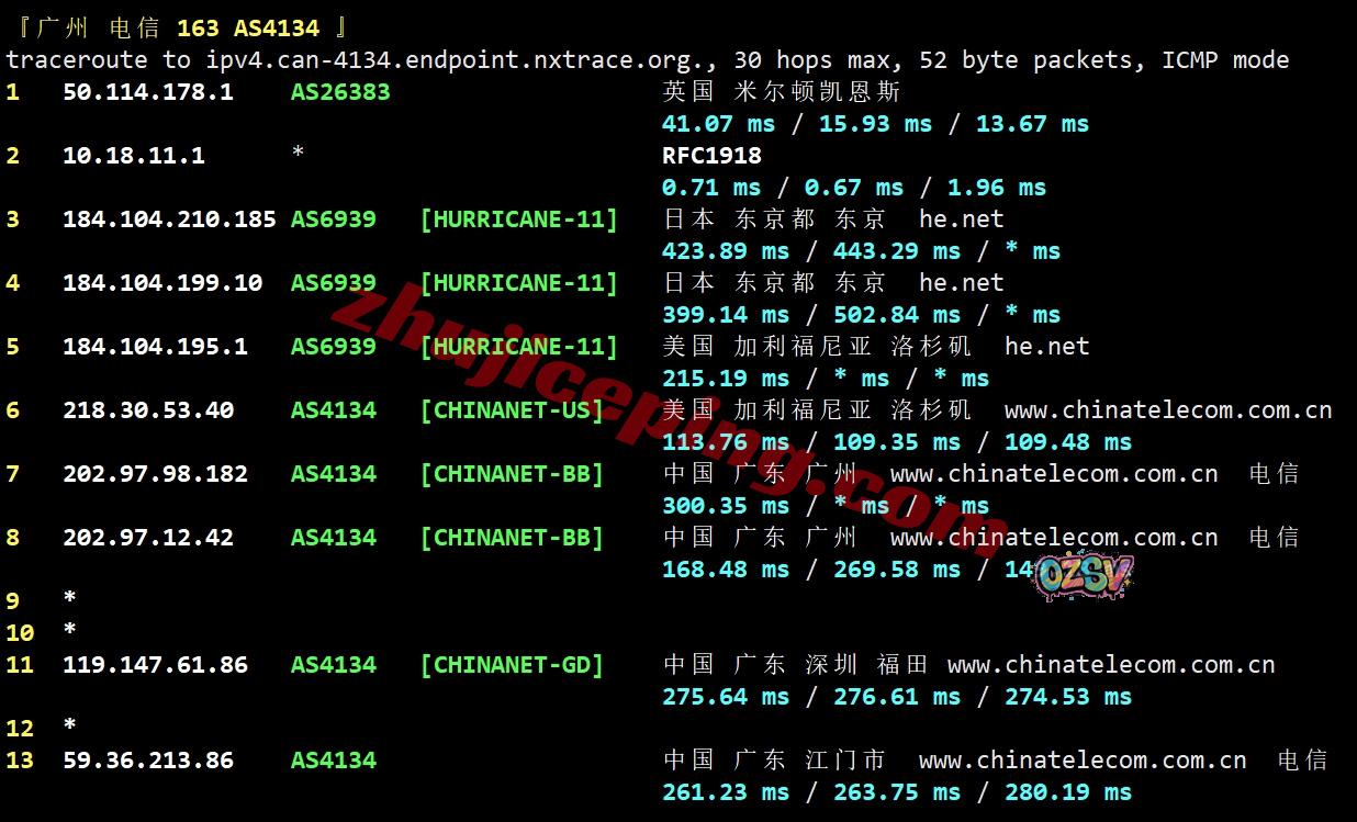 电信回程:走he.net去美国洛杉矶,然后从电信洛杉矶节点直连回国