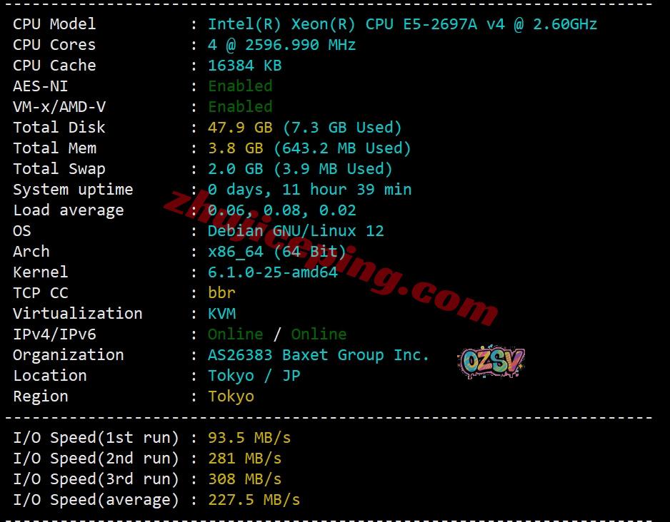 韩国机房的服务器用的CPU与绝多数机房的貌似也是一样的,CPU型号为e5-2697A V4(一般双路,32核、64线程、主频2.6GHz、加速频率3.6GHz),站长启用了BBR,justhost自己的AS,归属地日本东京,当前测试得I/O大致227MB/S: