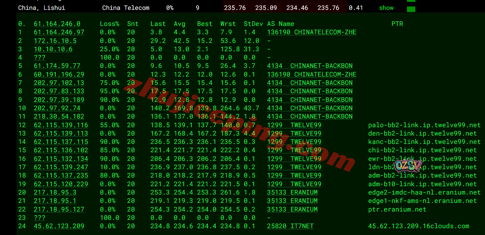 上海方向:走eranium接telia经过德国、英国,从移动英国伦敦CMI节点直连回国