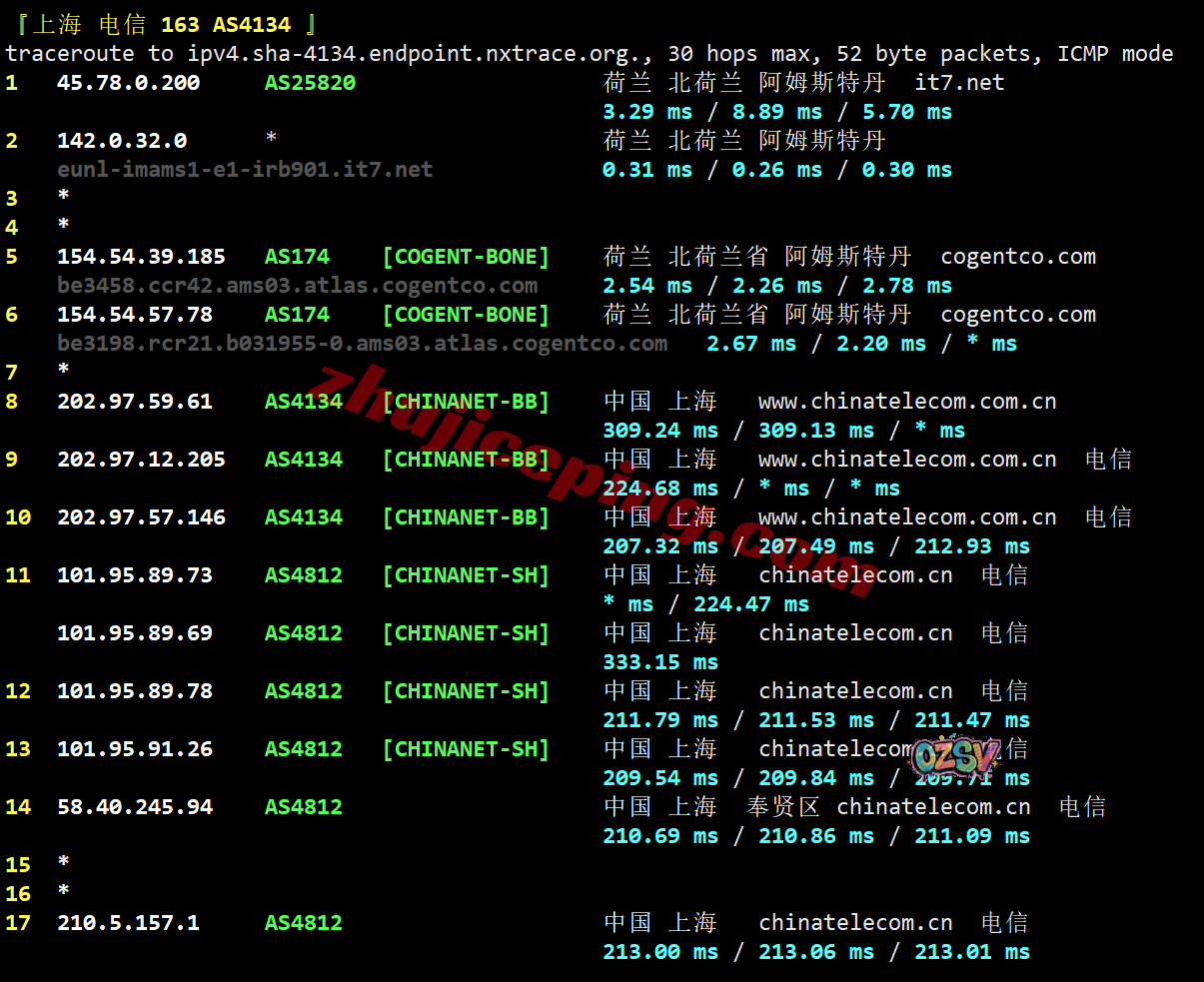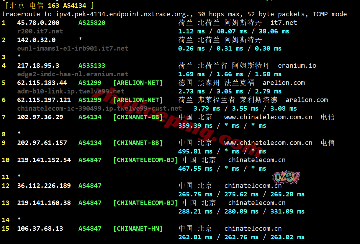 电信去程:直连电信美国圣何塞节点然后接telia一路往东从纽约出海去英国、荷兰
