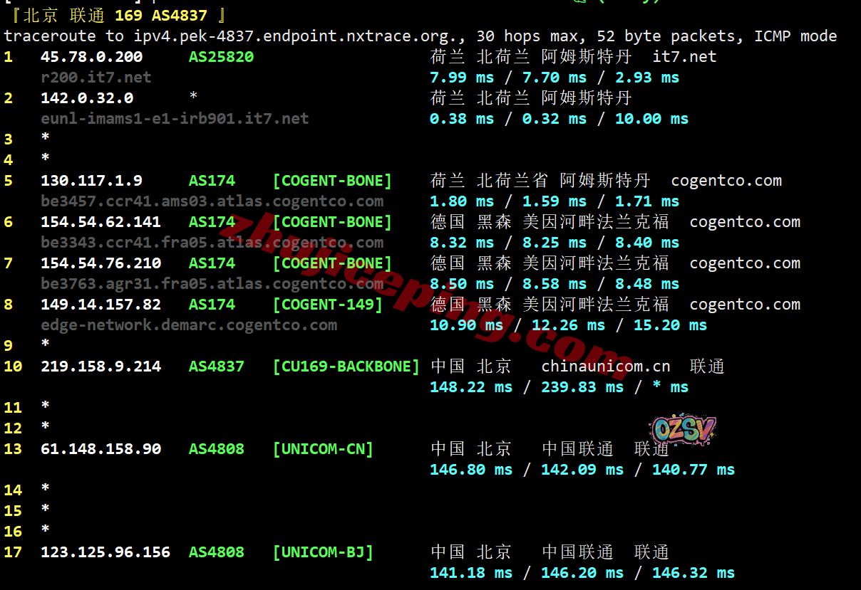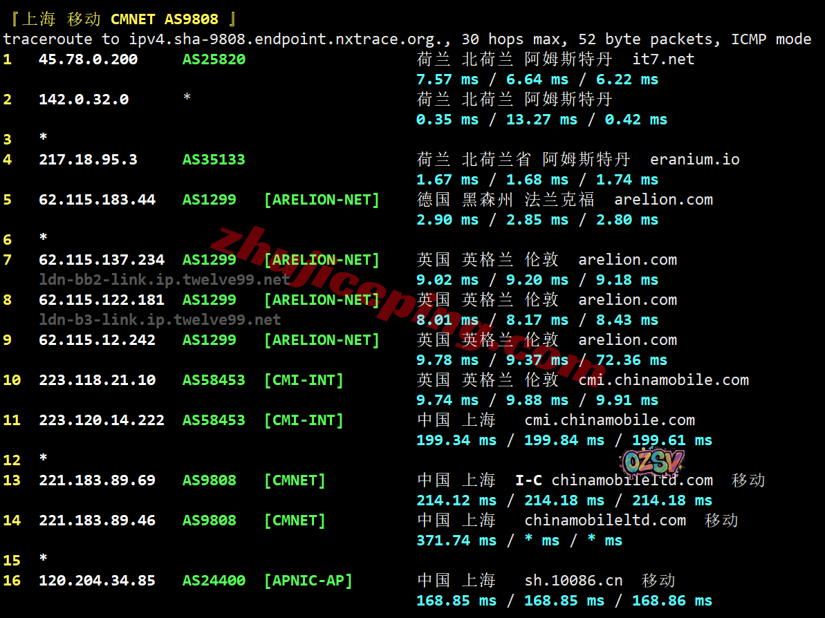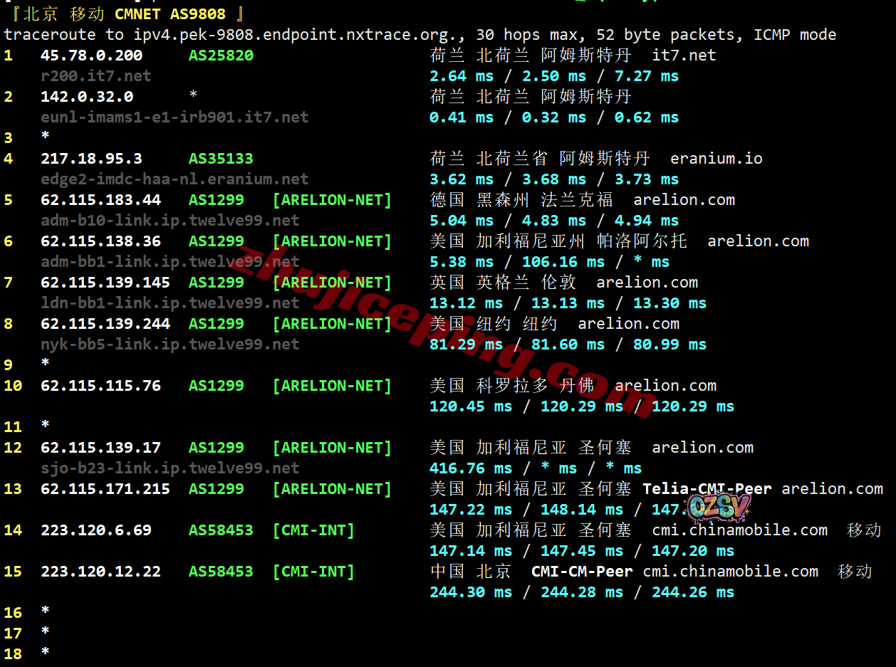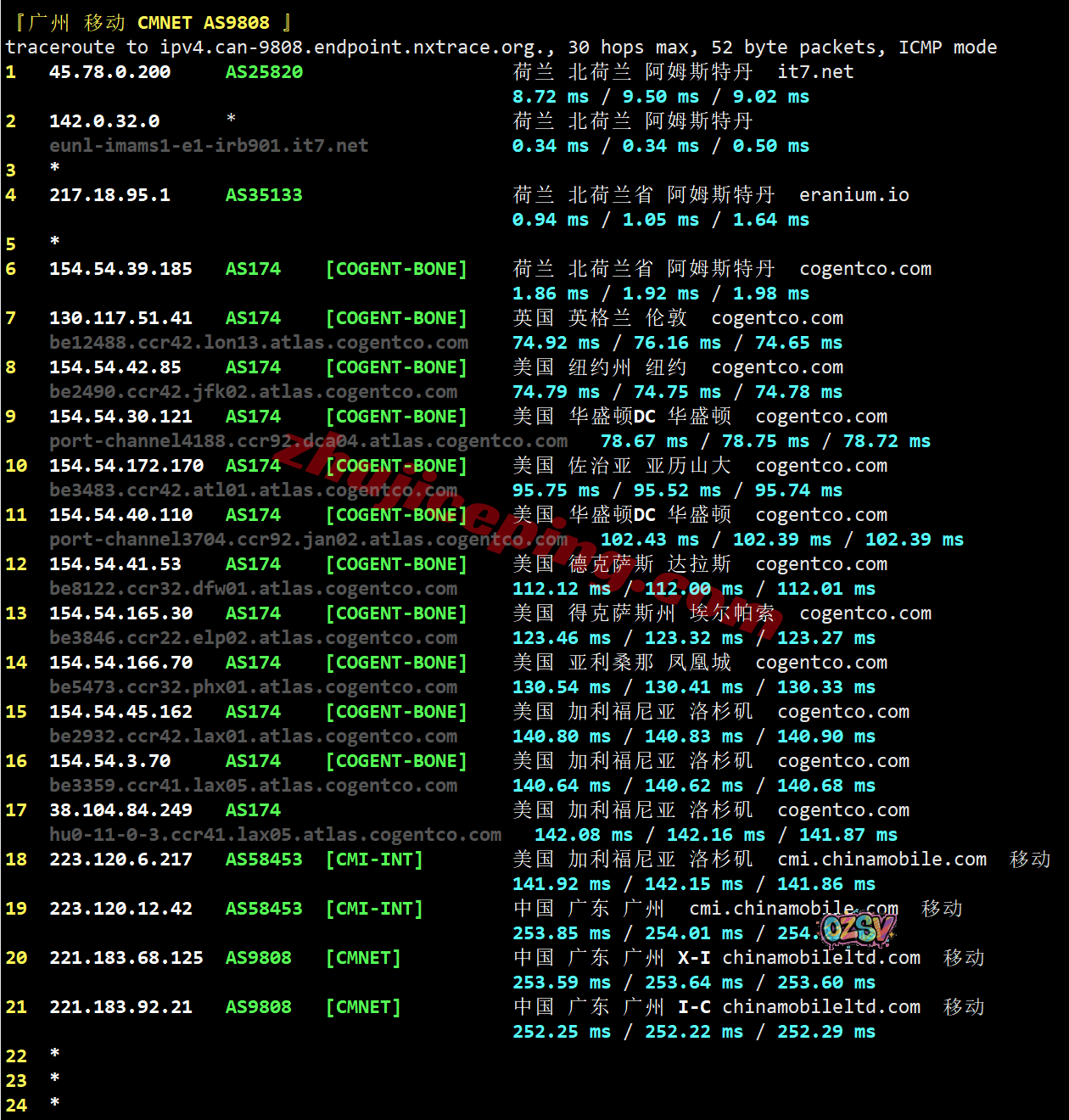 移动去程:直连移动英国伦敦节点,然后后街cogent去荷兰