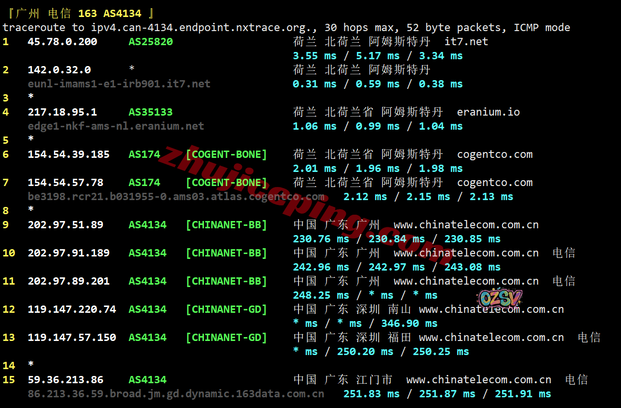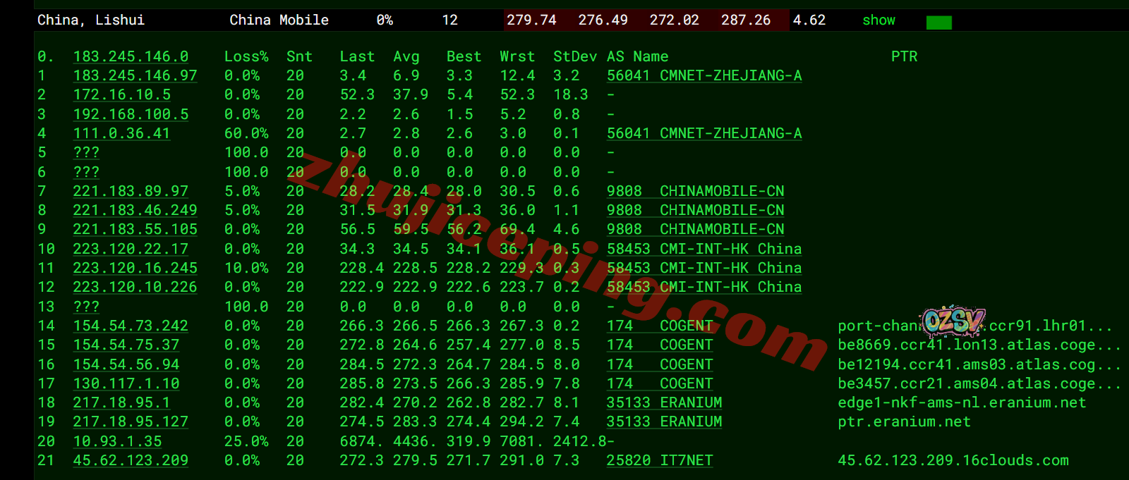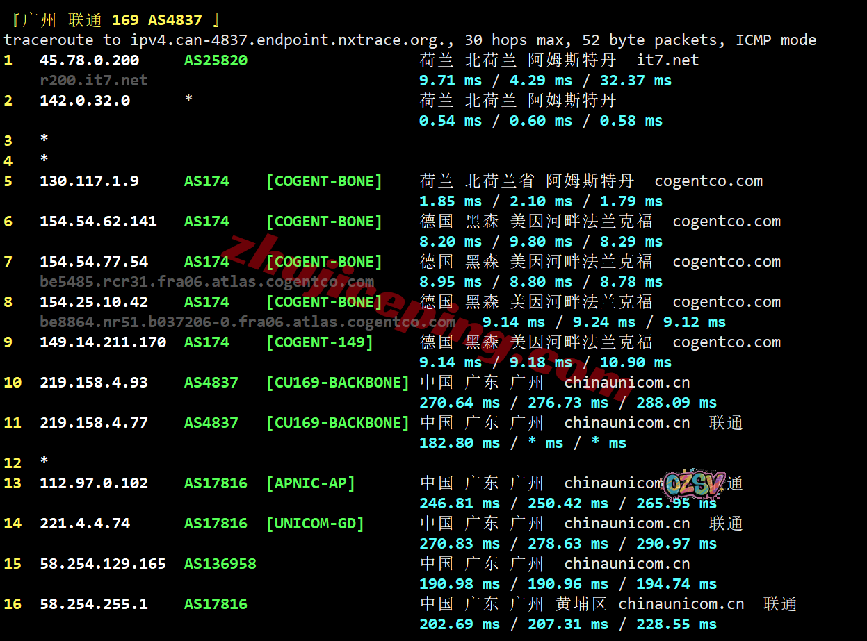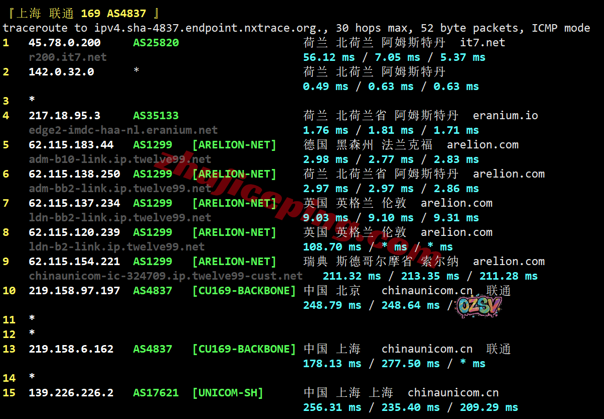 移动去程:直连移动英国伦敦节点,然后后街cogent去荷兰