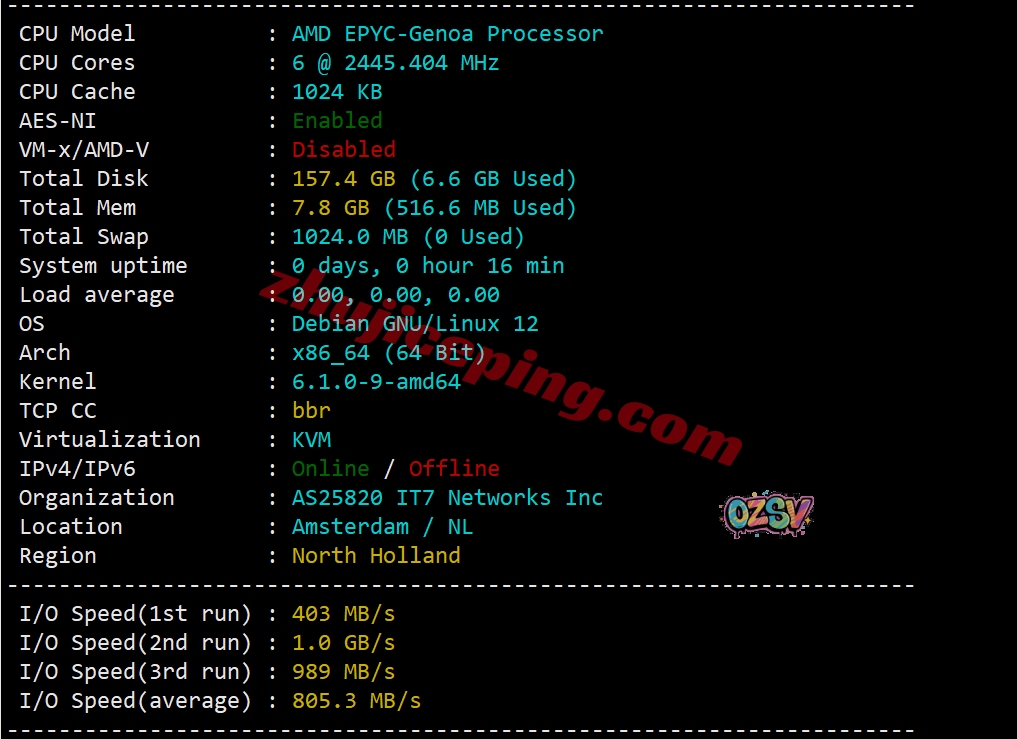 服务器的CPU具体型号未知,AMD EPYC 9004我是深表怀疑的(毕竟虚拟化是可以改的,至于说是7002还是7003这个就很难分辨了),底层KVM虚拟,官方系统默认开启了BBR,不支持IPv4(需要在后台自行点击启用),搬瓦工自己的网络,归属地荷兰阿姆斯特丹,当前测试I/O大致在805MB/S: