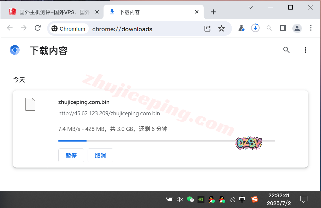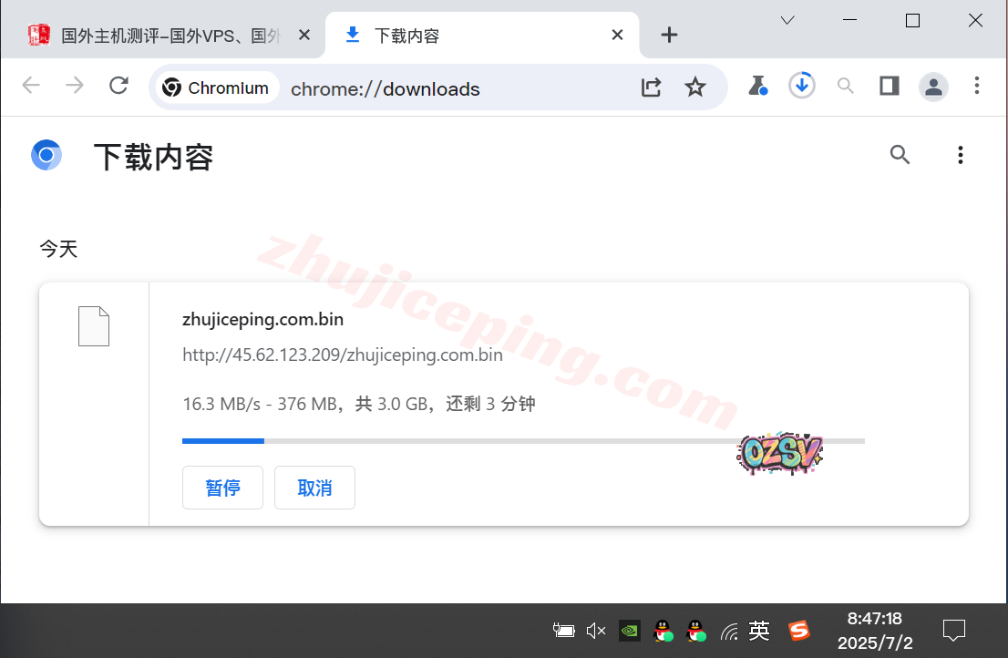 存放在测试VPS上的文件,站长广州联通家宽,直接用Chrome下载该文件,大致的下载速度如下: