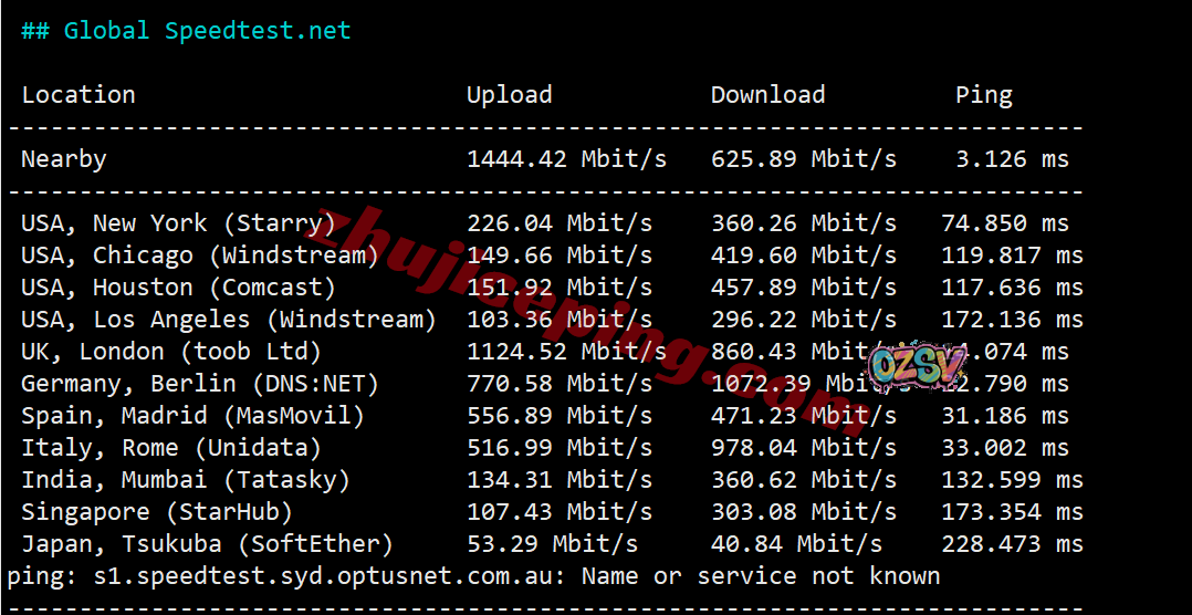 SpeedTest.Net的部分国际节点的带宽上下行测试数据: