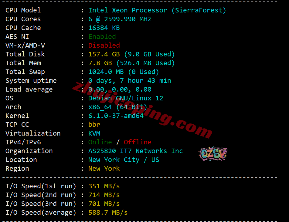 服务器CPU不清楚,主频2.6GHz,系统模板自动启用了BBR,底层KVM虚拟,不支持IPv6(需要自行在后台手动点击启用),网络为搬瓦工自己的,归属地美国纽约市,当前测试I/O大致588MB/S: