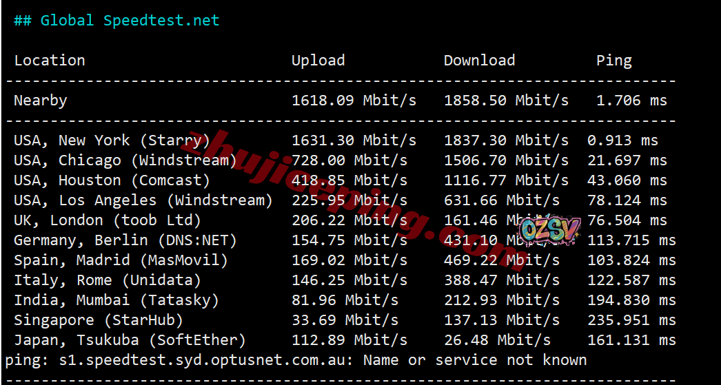 SpeedTest.Net的部分国际节点的带宽上下行测试数据如下: