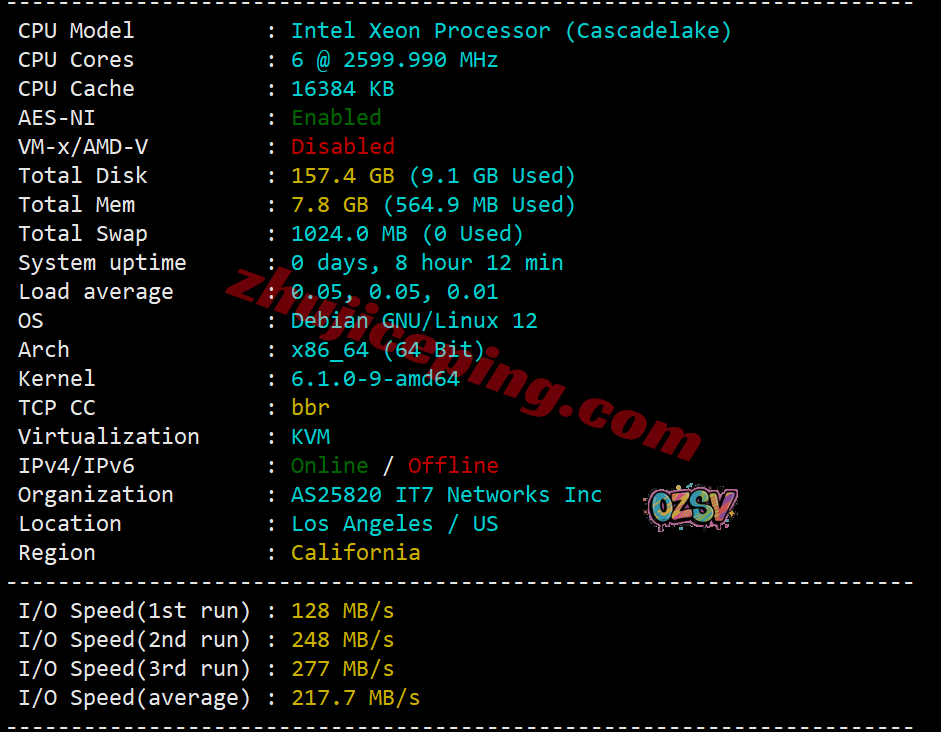 服务器所用的CPU型号未知,当前主频2.6GHz,官方已经在对各个机房的硬件进行升级,估计轮到USCA_2还要等等吧。系统模板默认启用了BBR,底层为KVM虚拟,不支持IPv6(需要在后台自行手动点击开启),搬瓦工自己的网络,归属地为美国洛杉矶,当前I/O实测在217MB/S的样子: