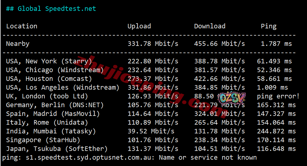 SpeedTest.Net的部分国际节点的带宽上下行测试数据: