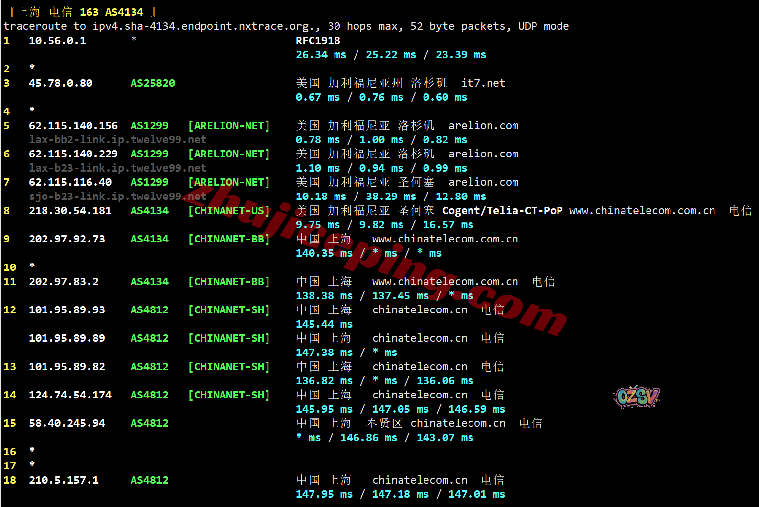 上海方向:机房出来接telia去圣何塞,从电信圣何塞pop/cogent/telia出海回国