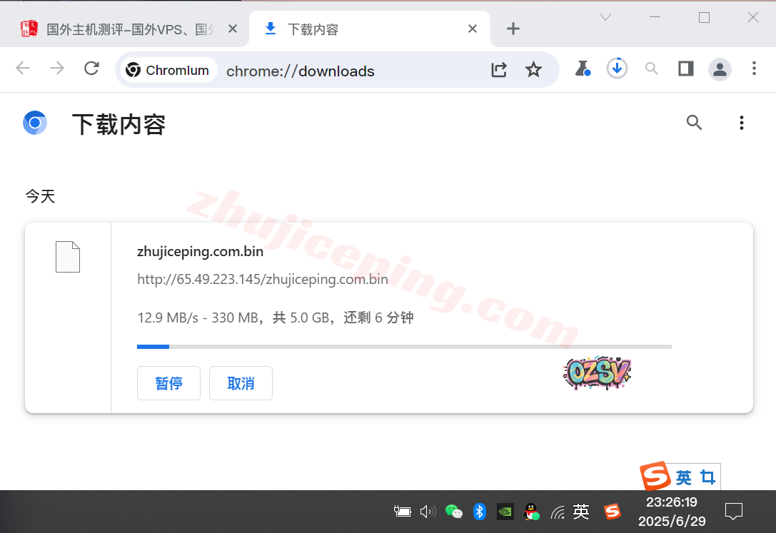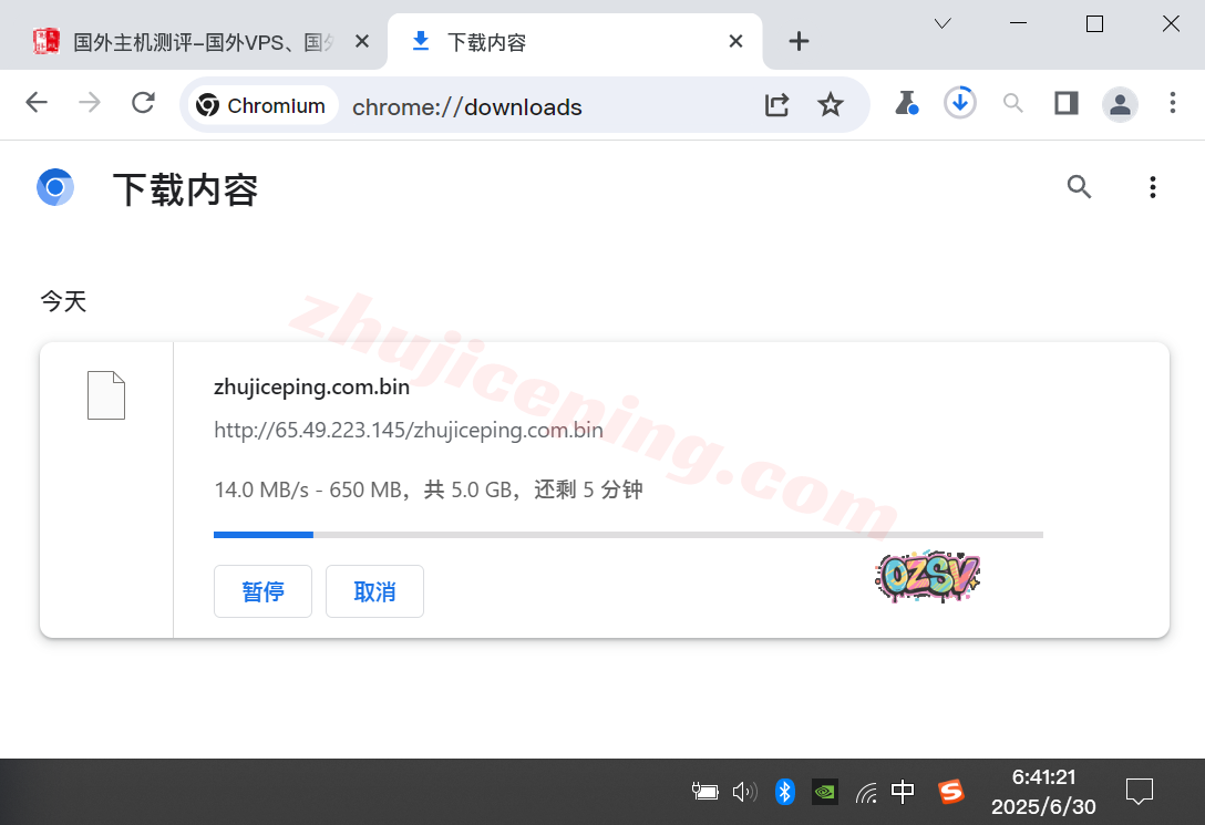 存放在测试VPS上的文件,站长为广州联通家宽,直接用Chrome下载该文件,大致的下载速度如下所示: