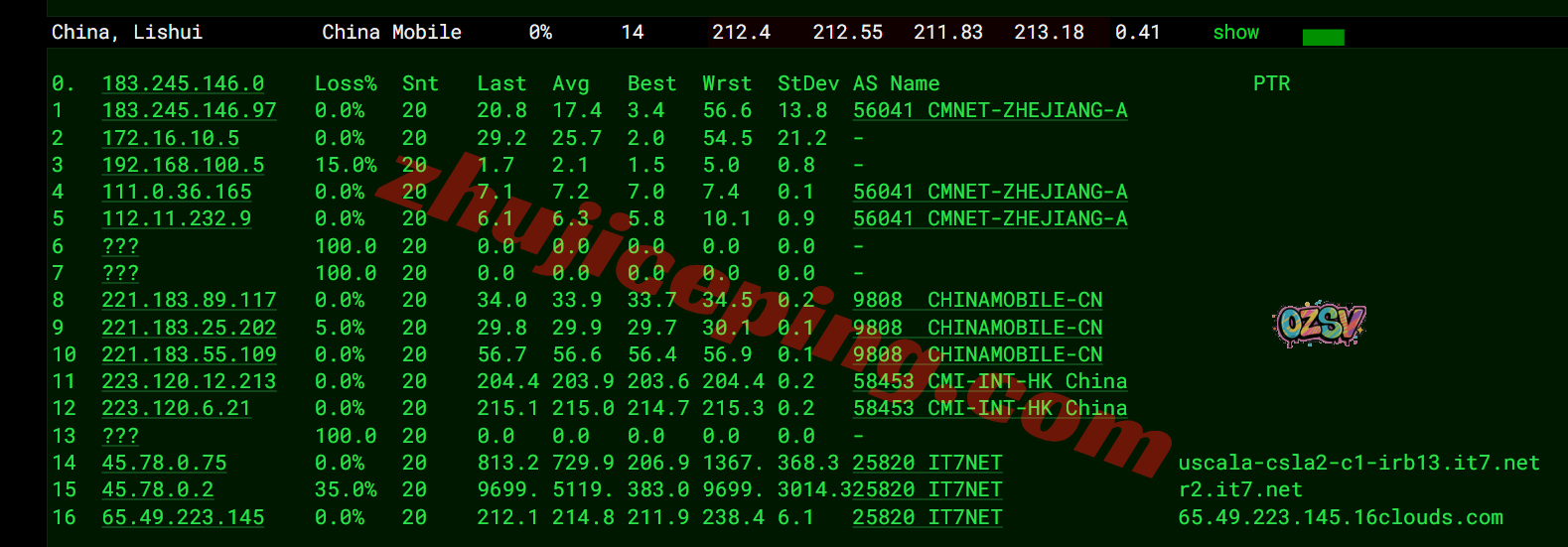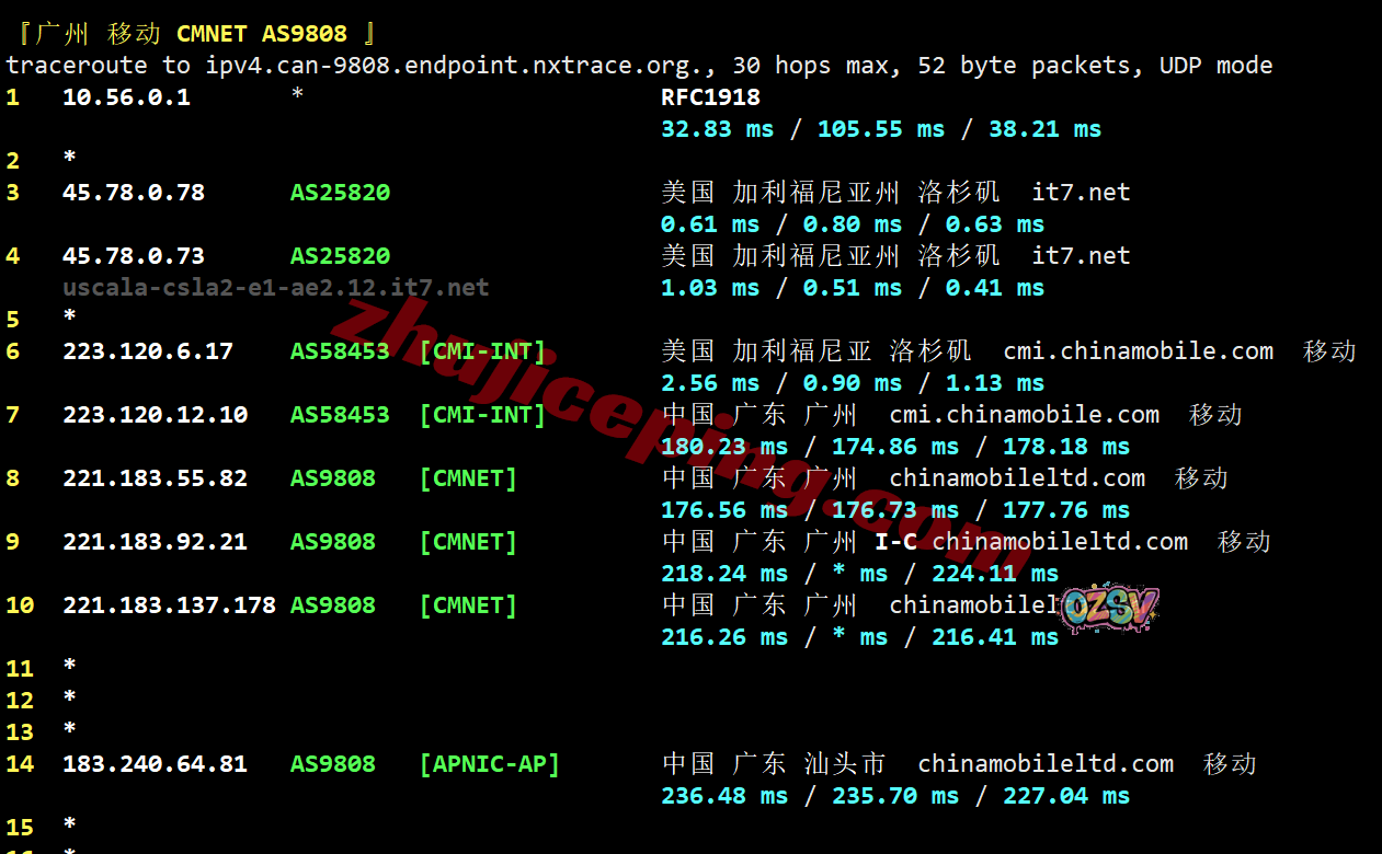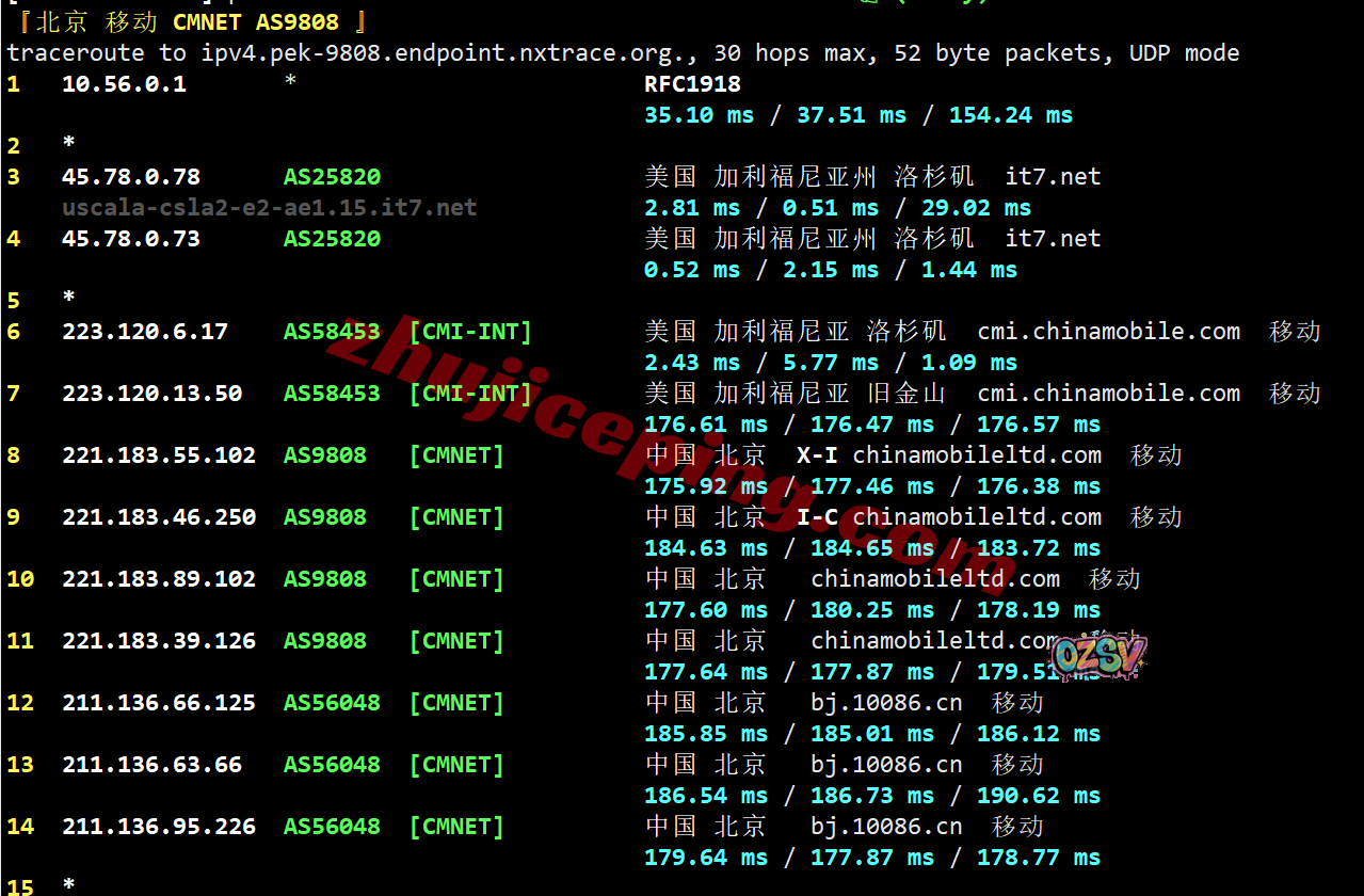 移动去程:直连移动美国洛杉矶节点,然后去机房