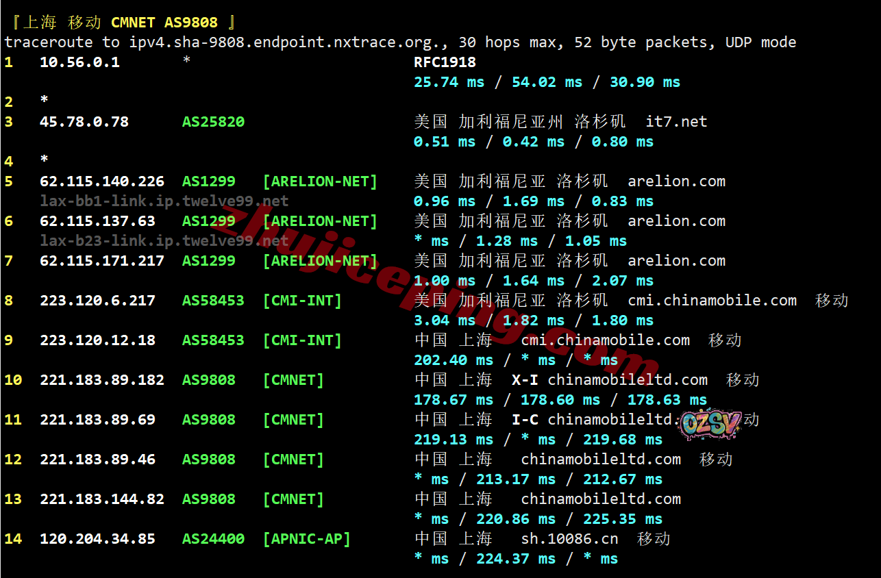 上海方向:搬瓦工的网络对接telia然后转移动洛杉矶CMI出海直连回国