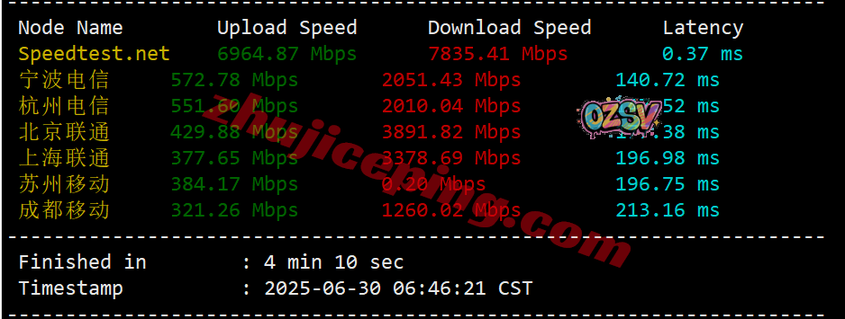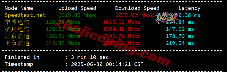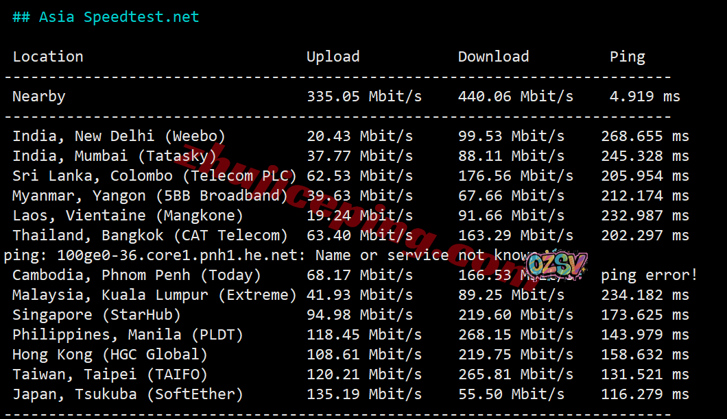 SpeedTest.Net的部分亚洲境内的节点的带宽上下行测试数据: