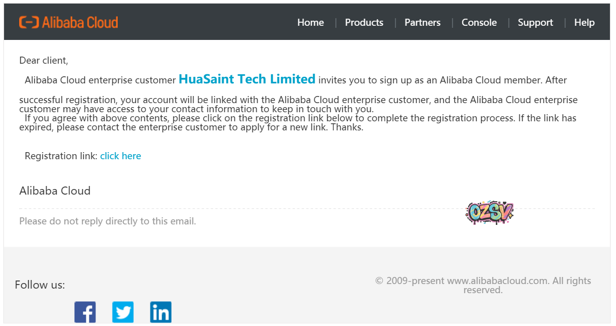 通过官网 www.huasaint.com 联系阿里云国际站经销商小飞机@HuaSaint给您发免实名账号注册邀请链接(官网有多种联系方式,包括邮箱,QQ,微信,TG等)