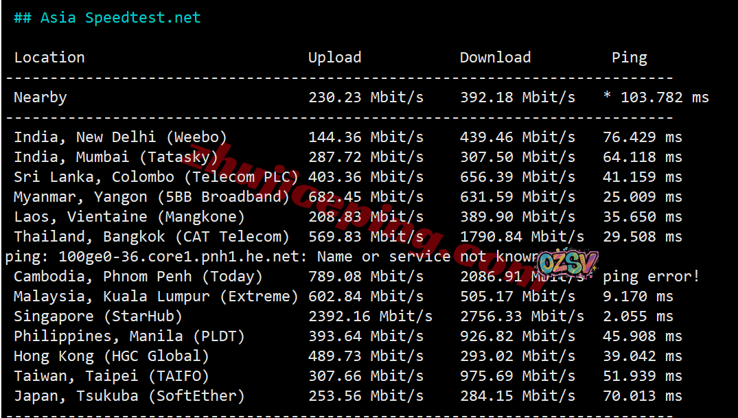 SpeedTest.Net的部分亚洲境内的节点的带宽上下行测试数据: