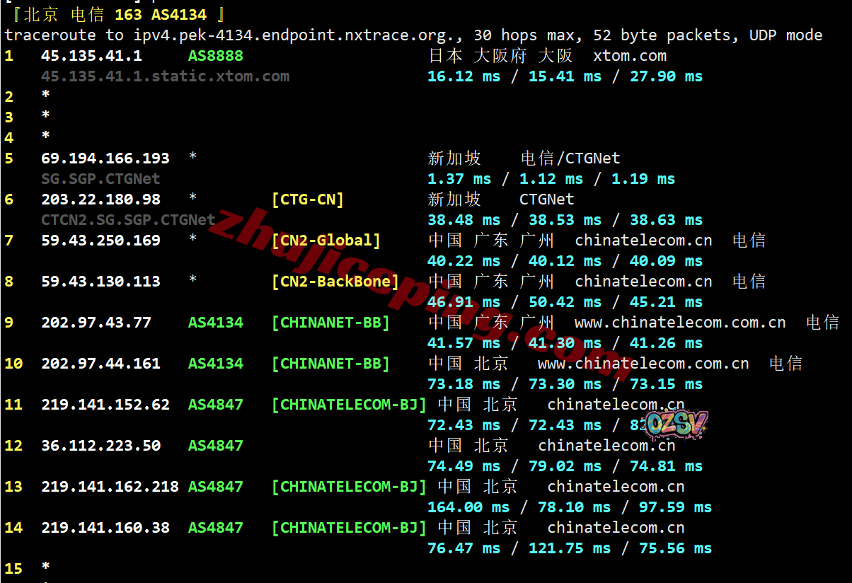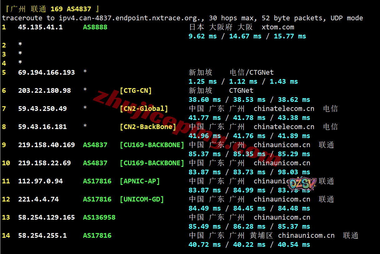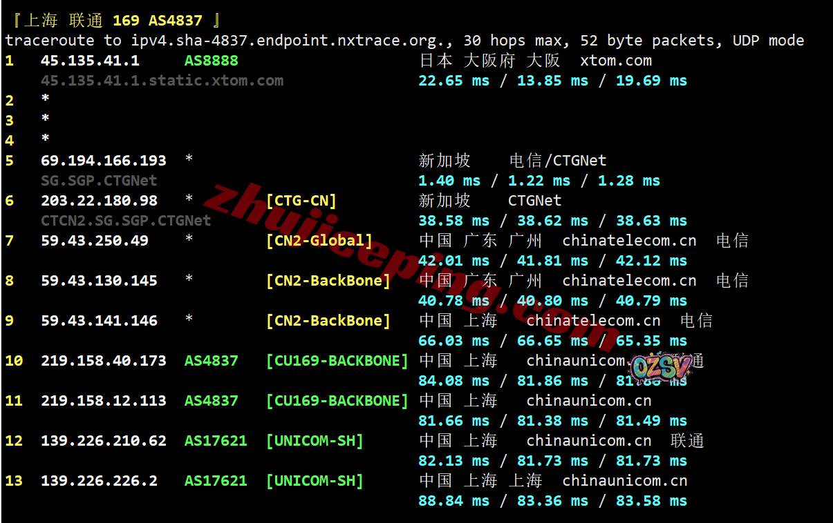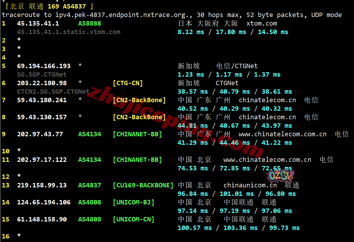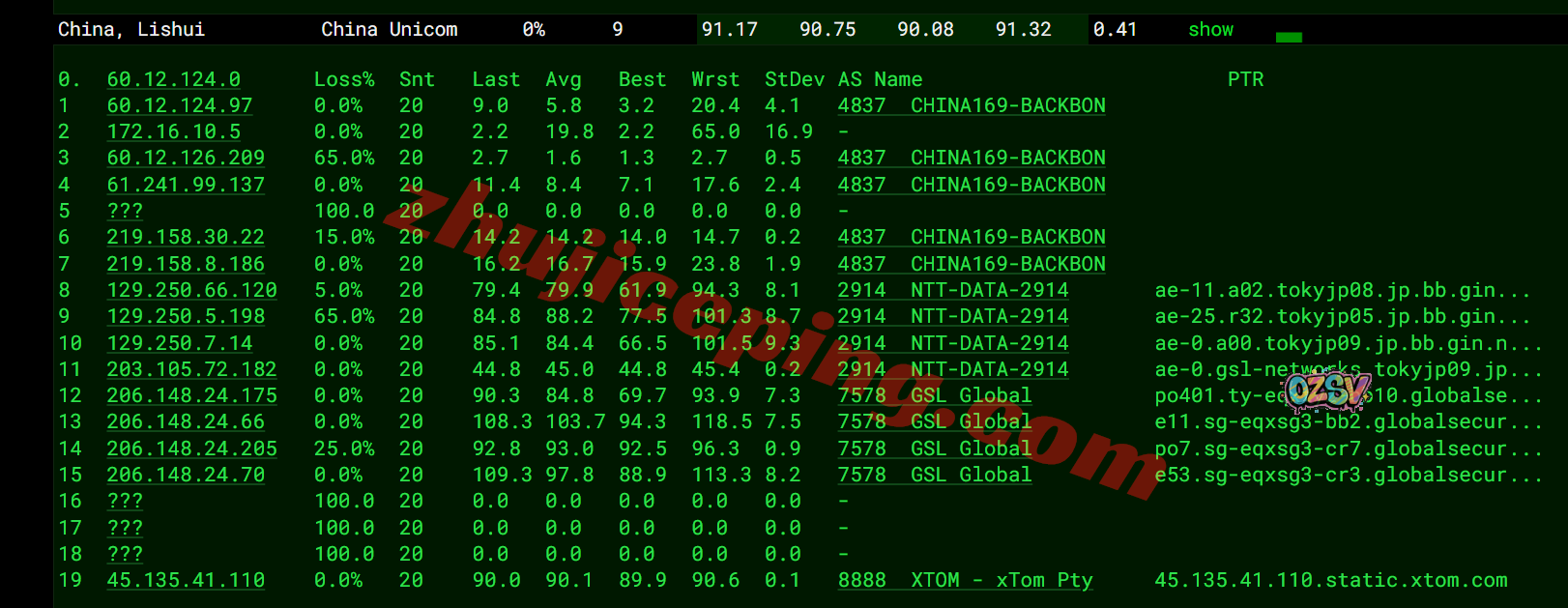 联通去程:联通接NTT先去日本东京,然后接GSL Networks 到新加坡