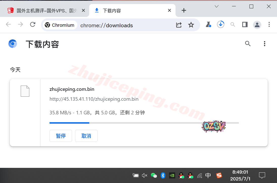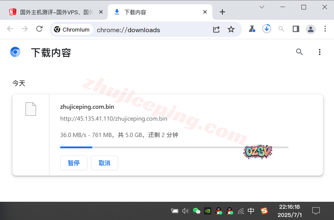 存放在测试VPS上的文件,站长是广州联通家宽,直接用Chrome来下载该文件,大致的下载速度如下: