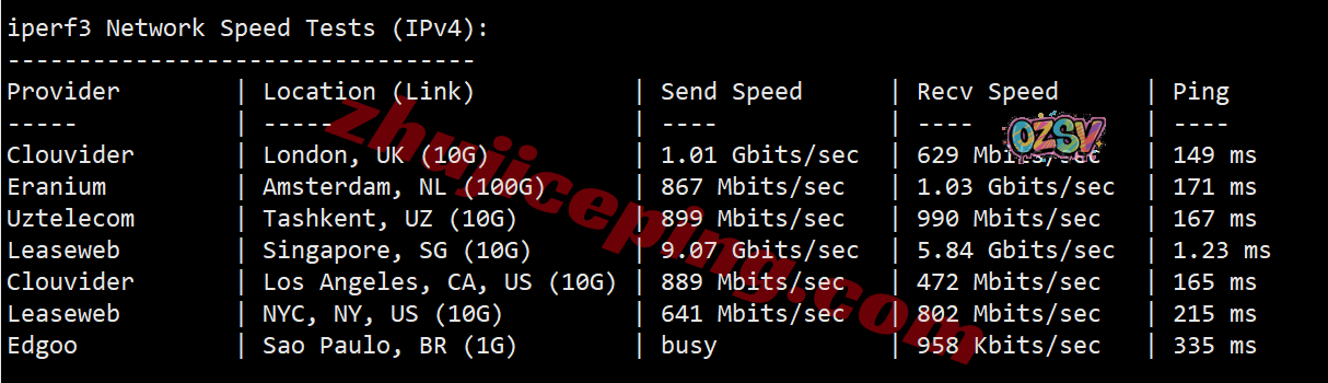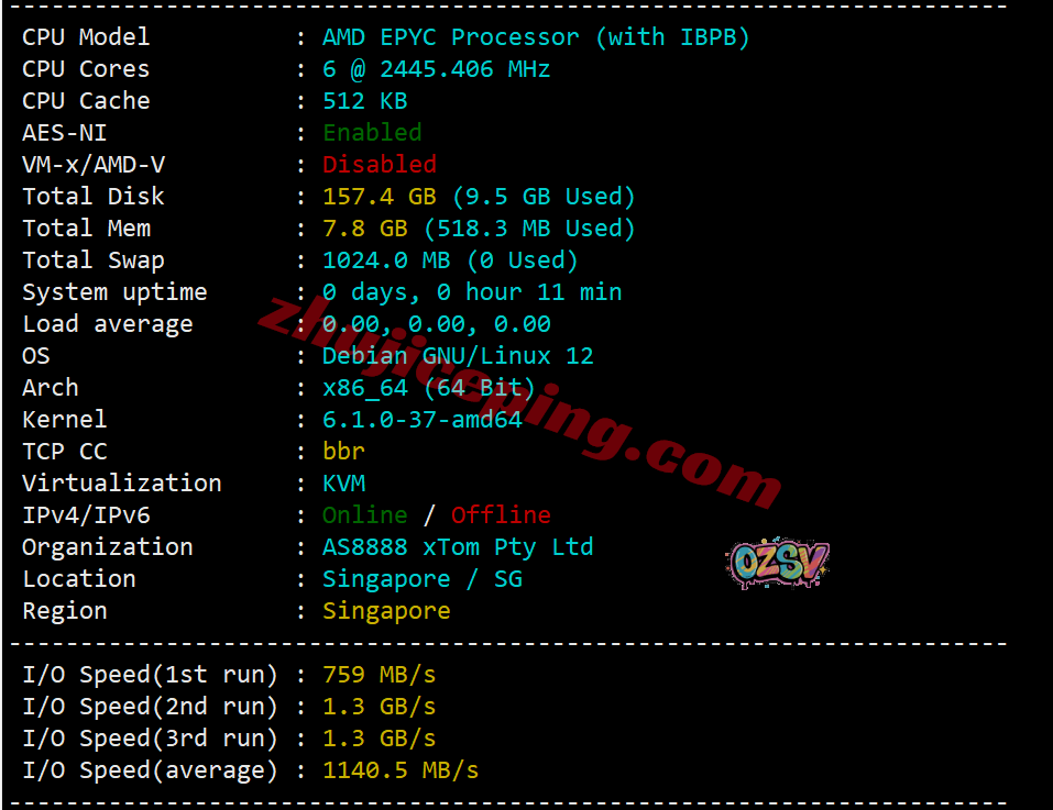 服务器的CPU用的AMD EPYC,主频2445.406MHz,从去年的测试得知具体型号为7763,系统自带BBR,底层KVM虚拟,不支持IPv6,上游网络提供商为XTOM,归属地新加坡,当前I/O测试大致1140MB/S: