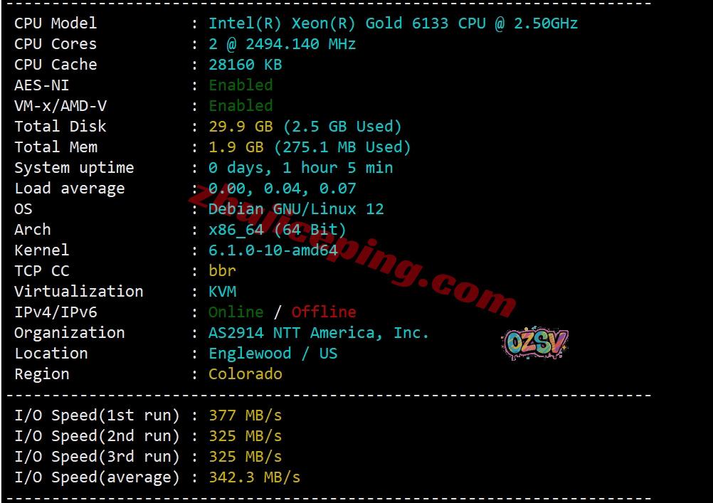 服务器用的CPU型号为Intel Xeon Gold 6133(20核、40线程、2.5GHz主频、加速3GHz),站长启用了BBR,不支持IPv6,上游为美国NTT,归属地为归属地恩格尔伍德(科罗拉多州),当前I/O测试大致在342MB/S: