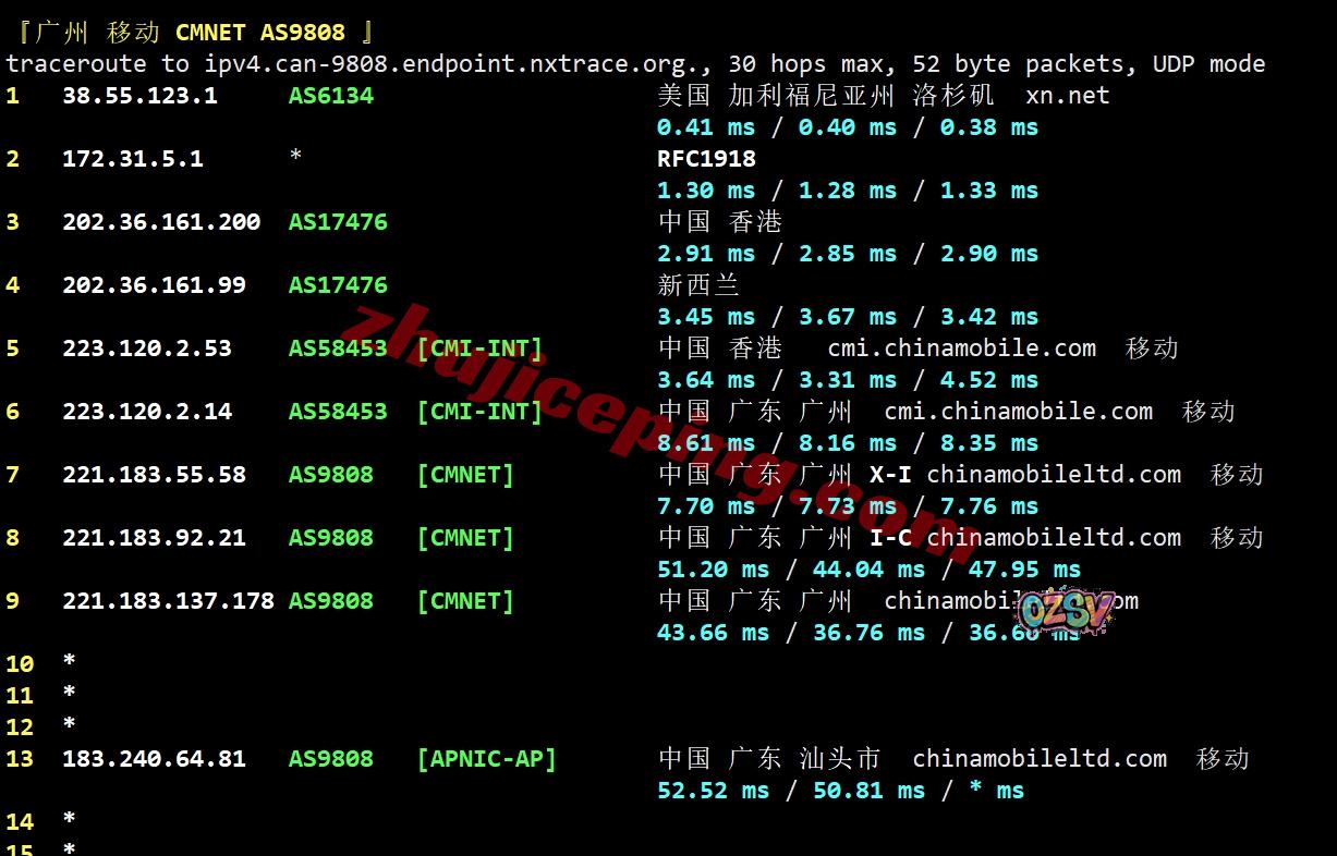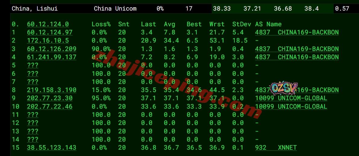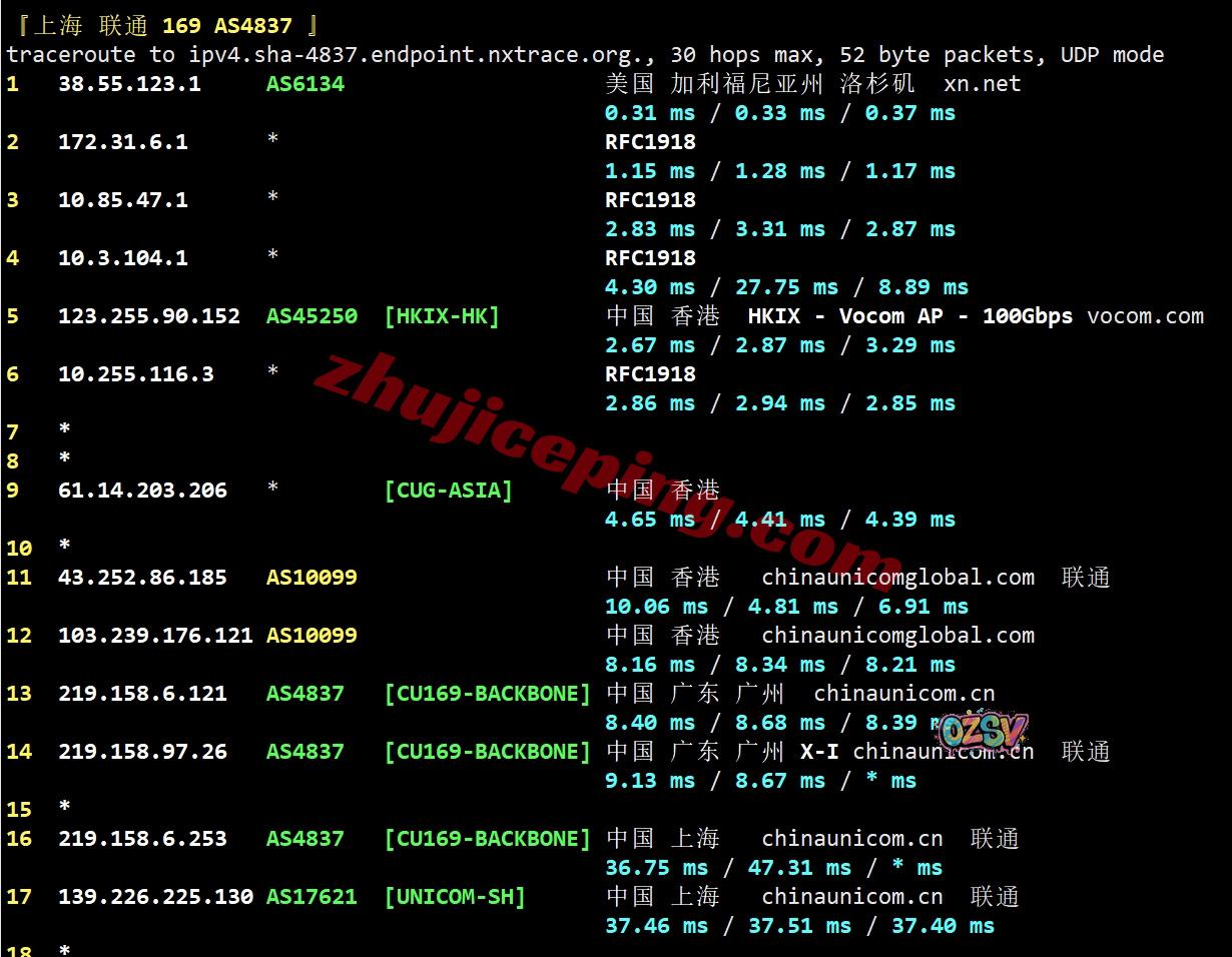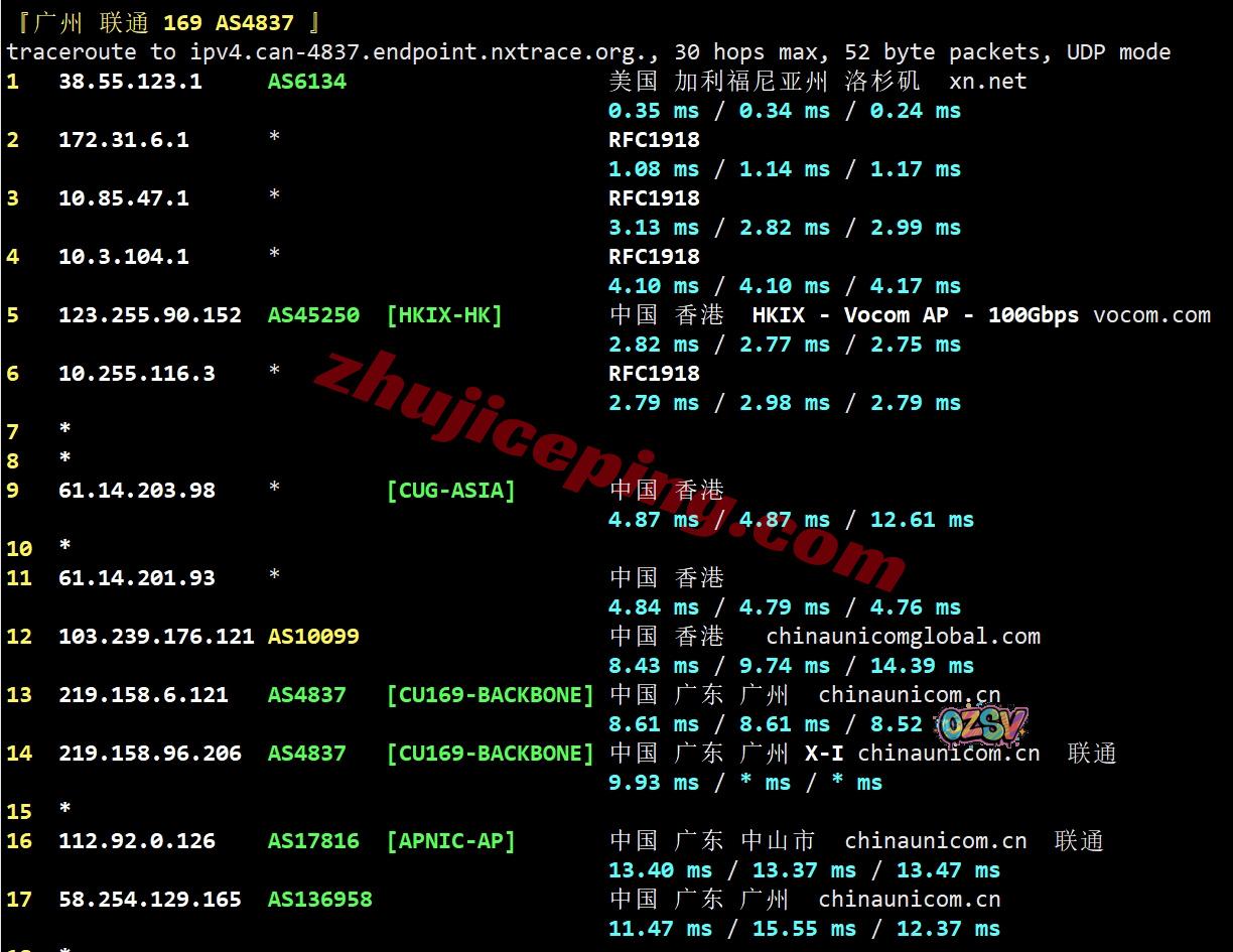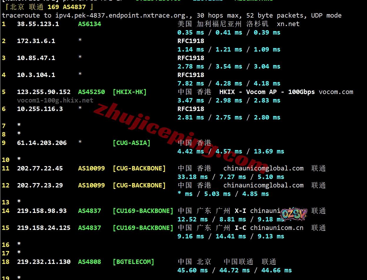 联通回程:在香港经过HKIX交换中心后接联通AS10099直连回内地