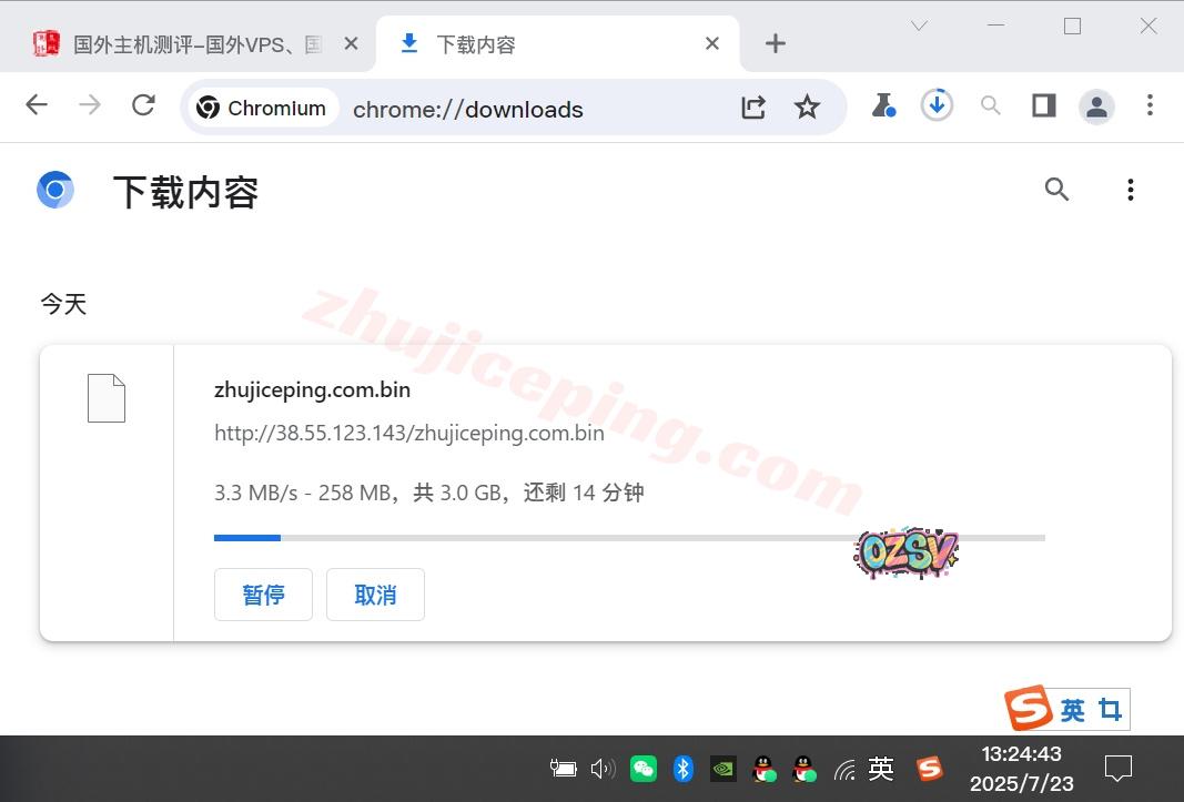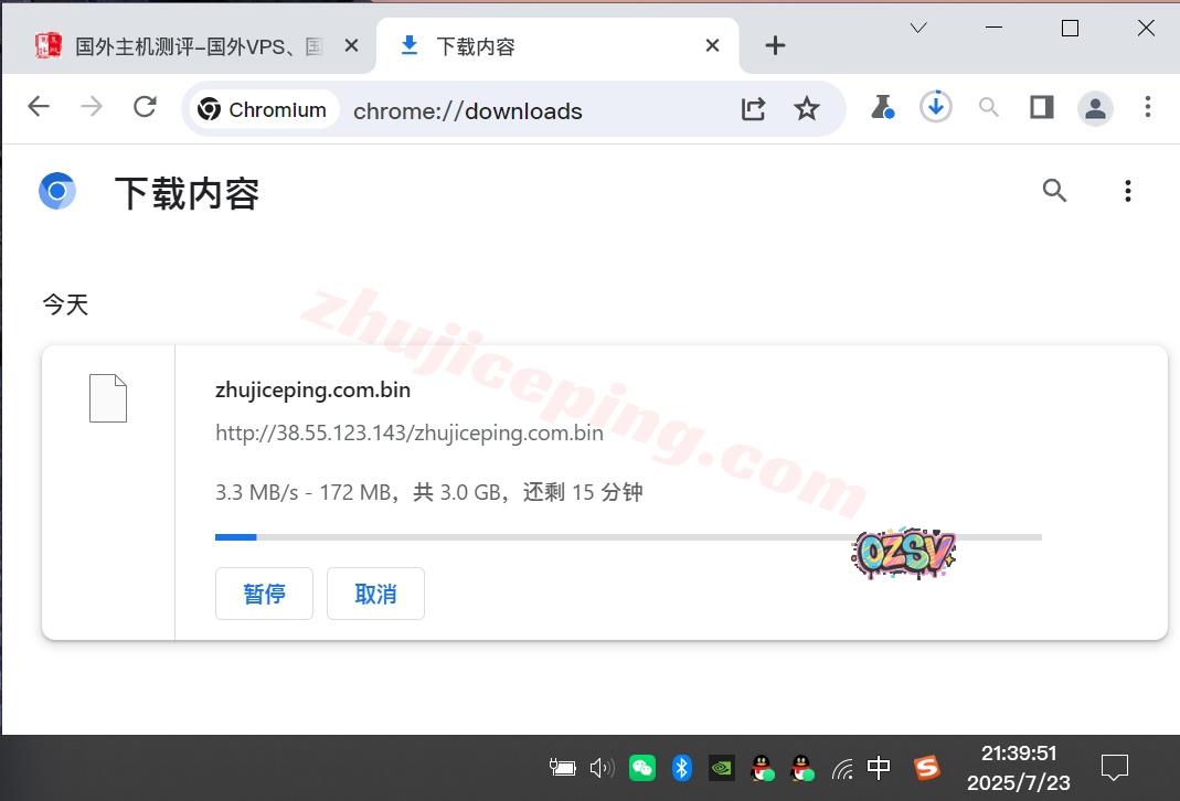 存放在测试VPS上的文件,站长广州联通家宽,用Chrome直接下载该文件,大致的下载速度如下所示: