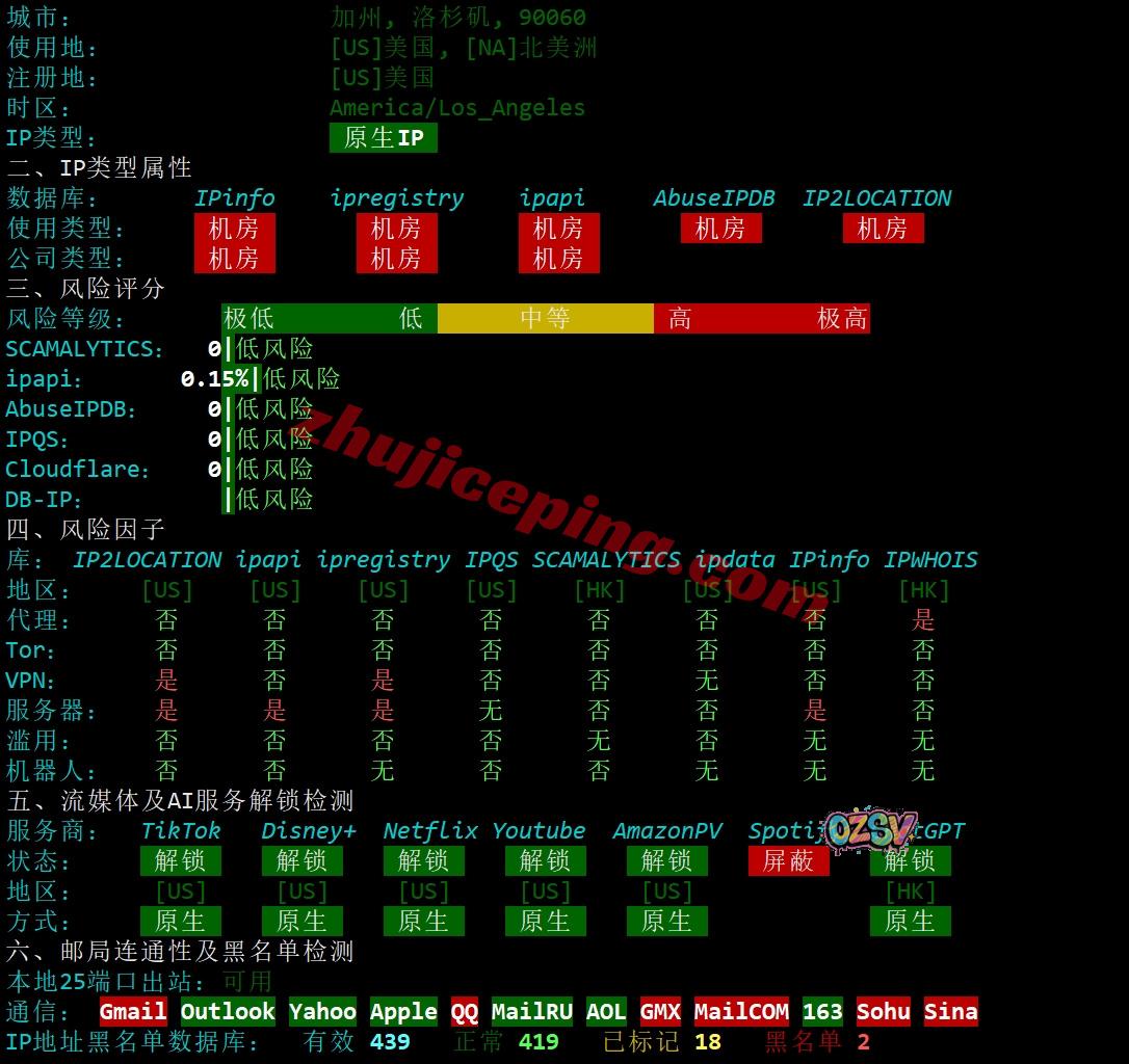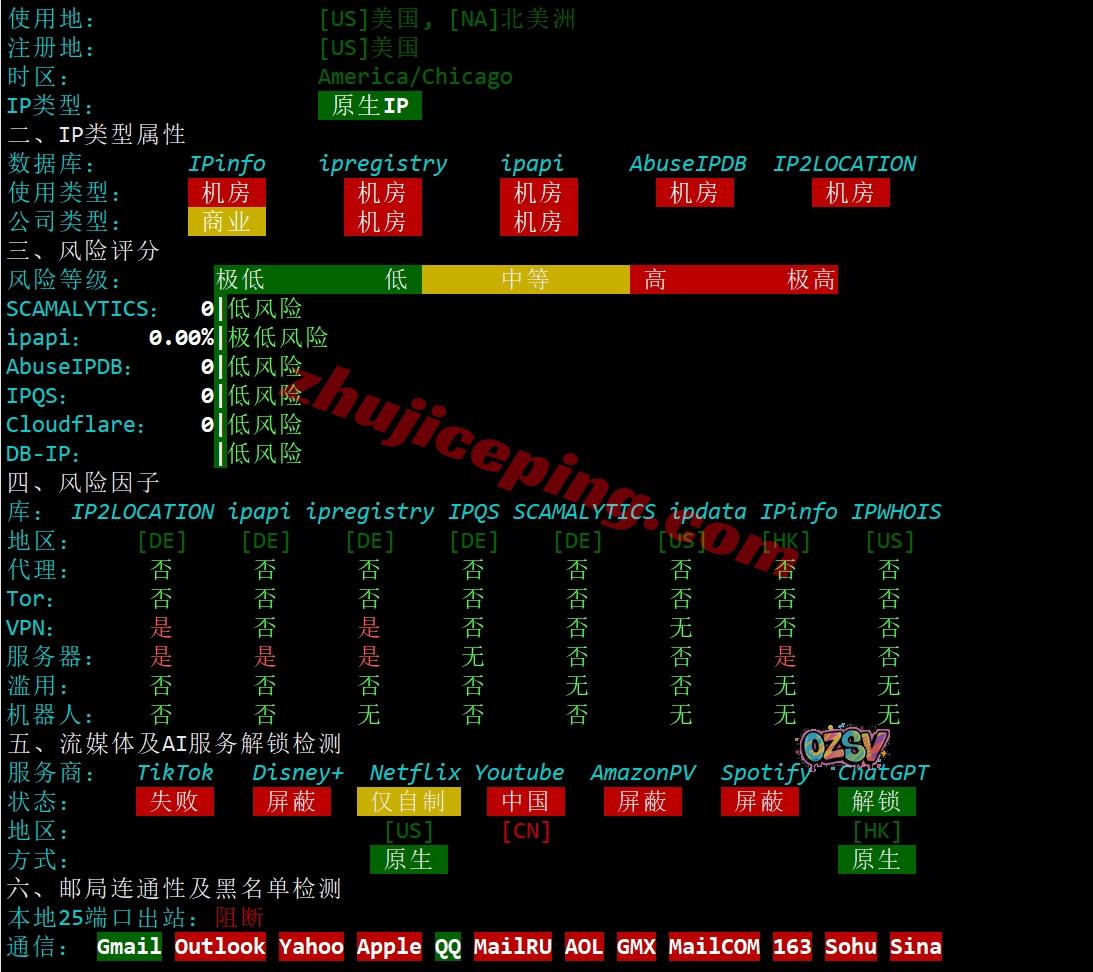 多个数据库对当前IPv4性质的判断,美国原生IP,没有屏蔽25端口 :