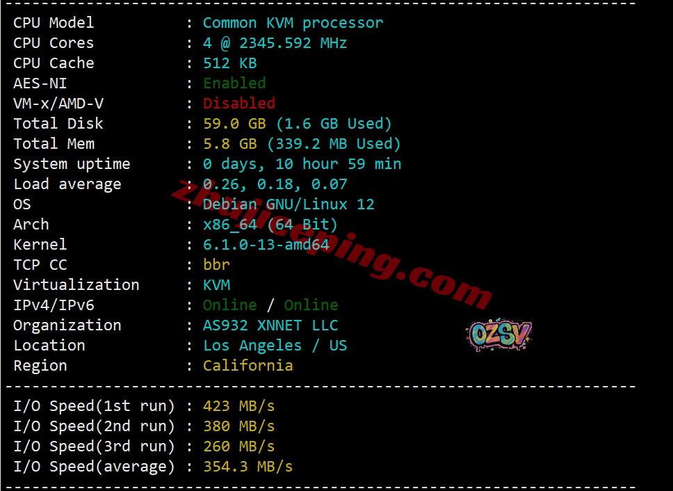 服务器用的CPU型号未知,主频2345.592MHz(这感觉有点像AMD EPYC,纯属猜测),站长启用了BBR,支持IPv4&v6,上游网络提供商为XNNET,归属地美国洛杉矶(明显的广播IP),当前I/O大致在354MB/S的样子: