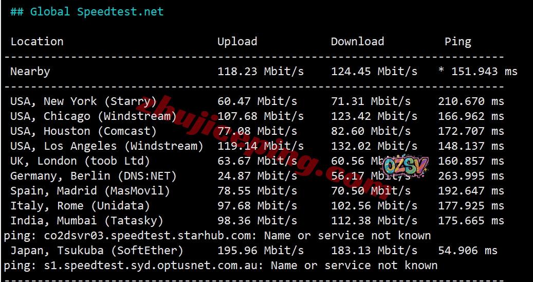 SpeedTest.Net的部分国际热门节点的带宽上下行测试数据: