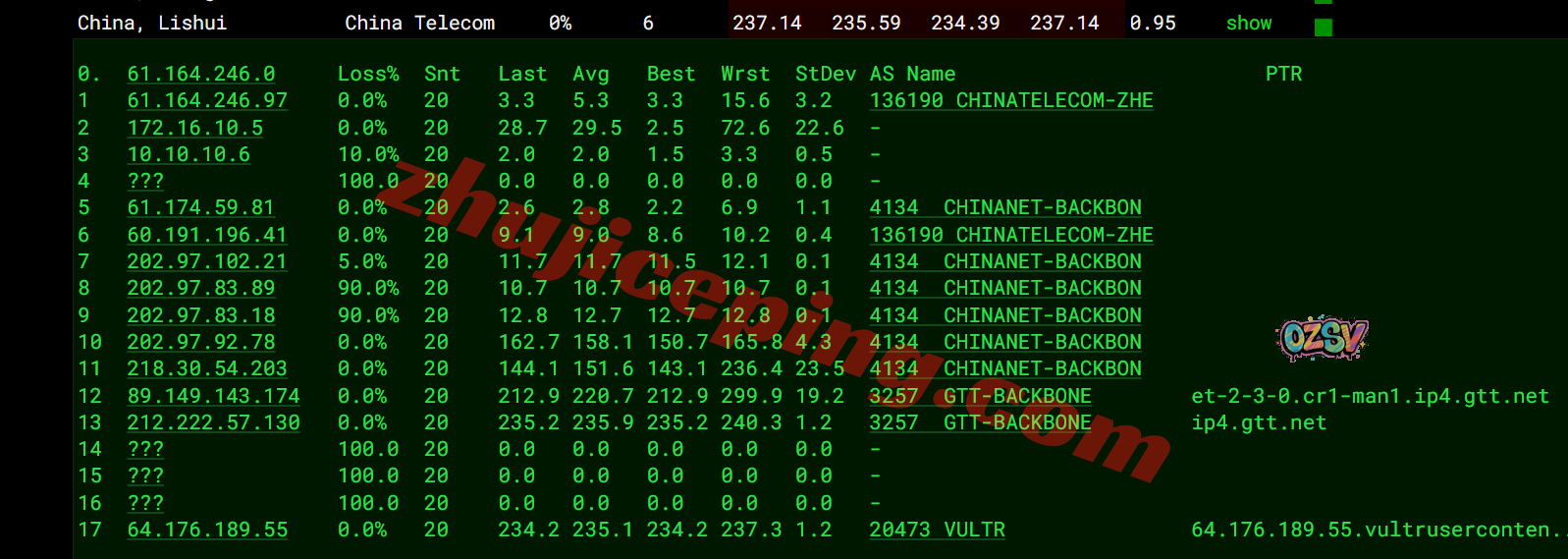 电信去程:直连电信美国圣何塞节点然后出海接GTT到英国