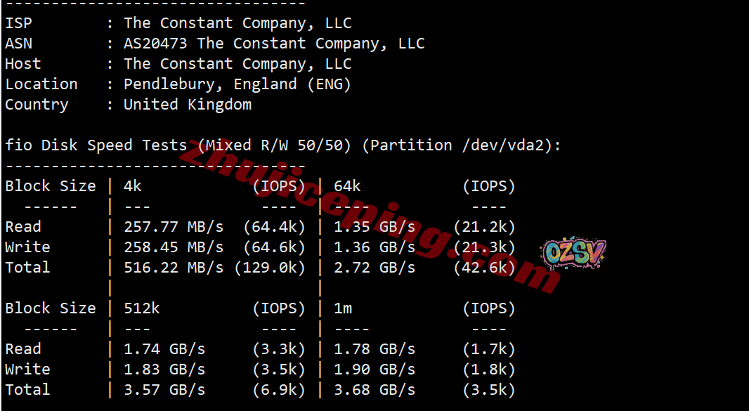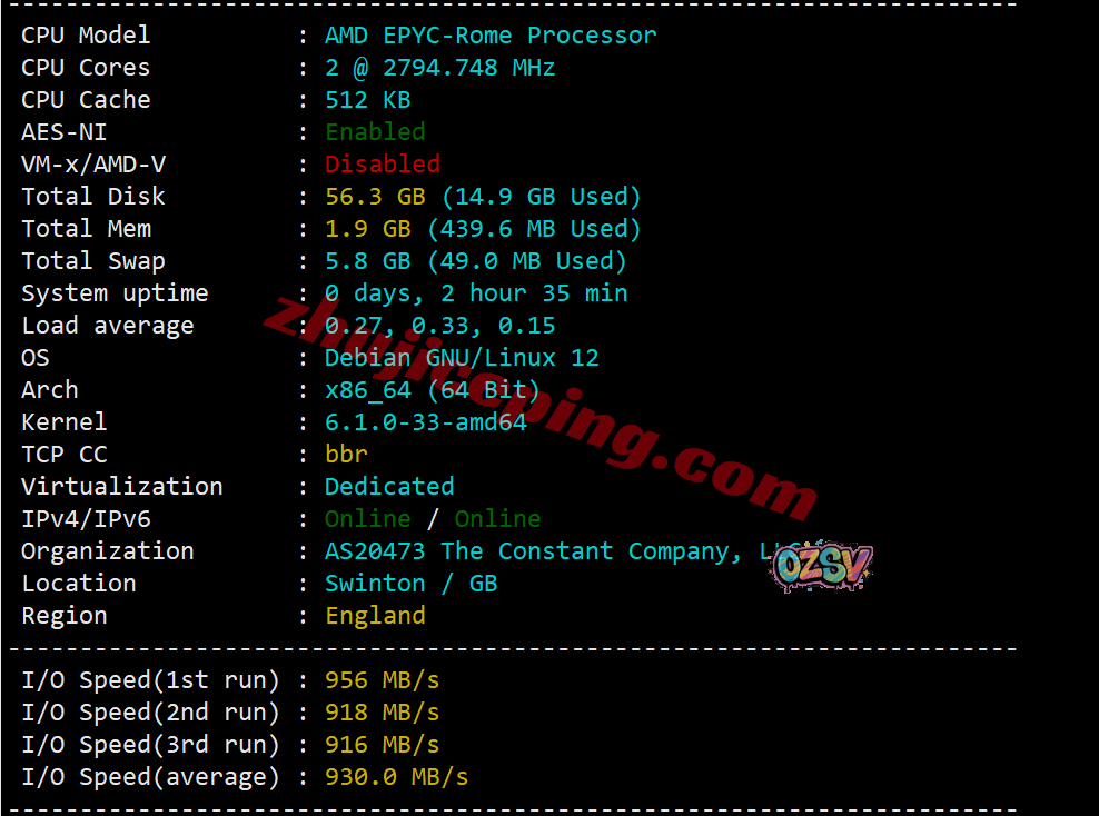 服务器所用的CPU具体型号未知,可以看到的是AMD EPYC -Rome /7002系列,主频2794.748MHz(盲猜一个AMD EPYC 7282?)站长启用了BBR,支持IPv4&v6,上游The constant company其实就是vultr的母公司,归属地斯温顿(这个因不同的数据库问题结论可能不一样),当前测试I/O大致在930MB/S: