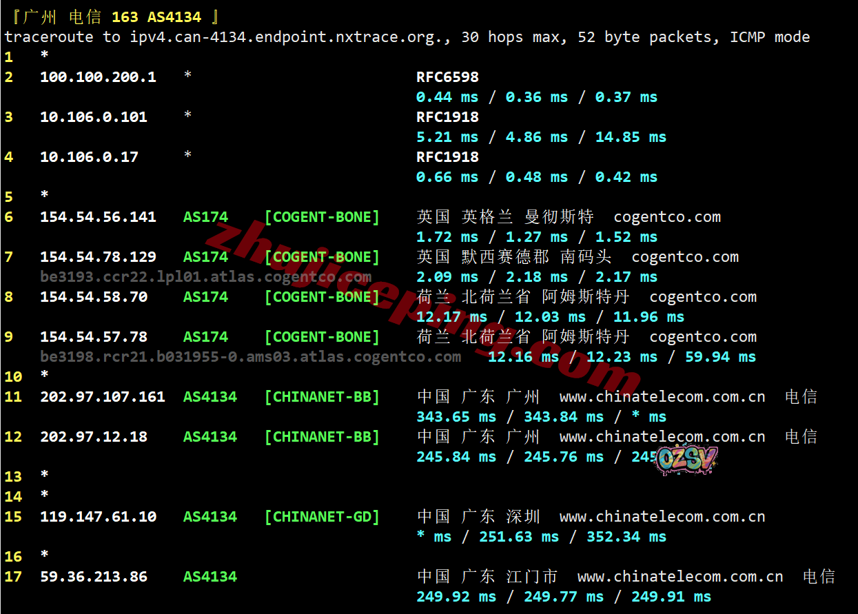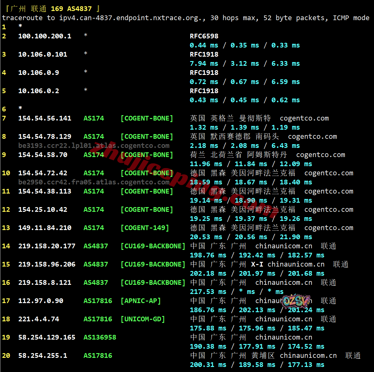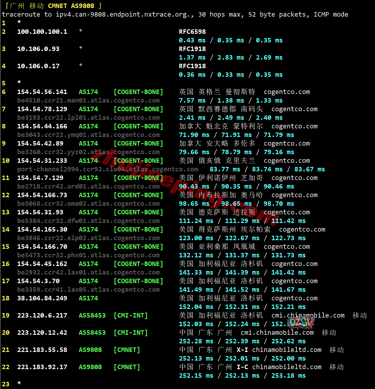广州方向:走cogent去加拿大然后去美国俄亥俄州然后西行到洛杉矶,再从移动洛杉矶CMI节点直连回国