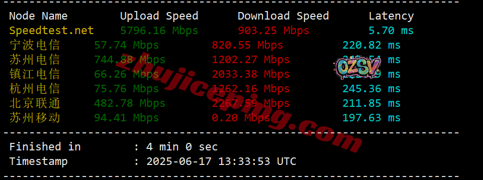 SpeedTest.Net的部分亚洲境内的节点的带宽上下行测试数据: