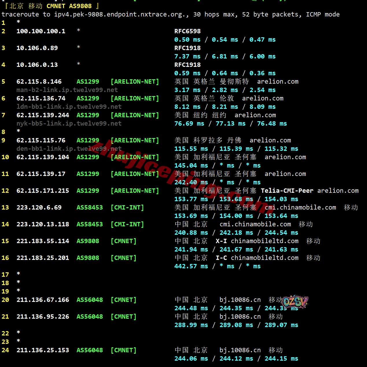 北京方向:走telia经过伦敦出海去美国纽约,然后向西从移动圣何塞CMI节点直连回国