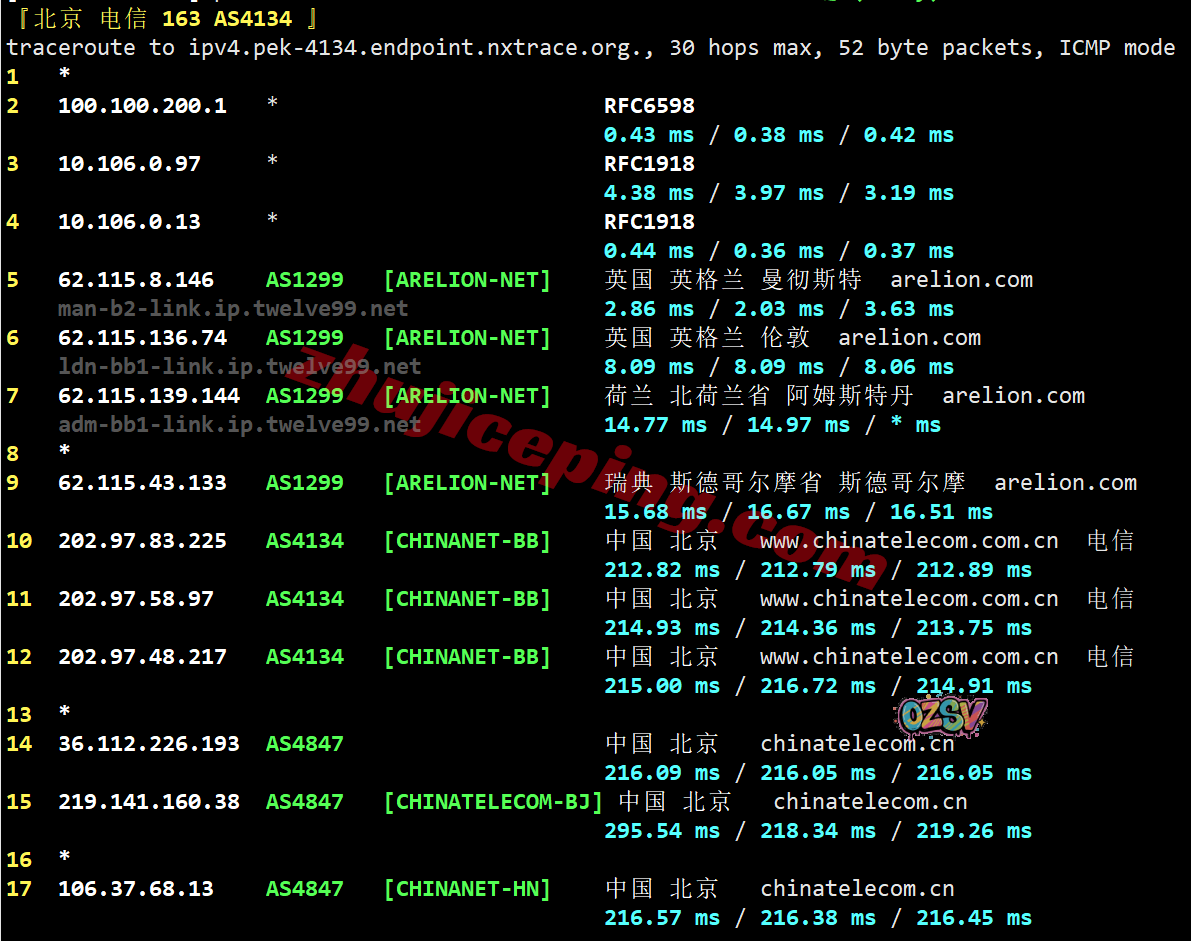 北京方向:走telia经过英国、荷兰、瑞典出海回国