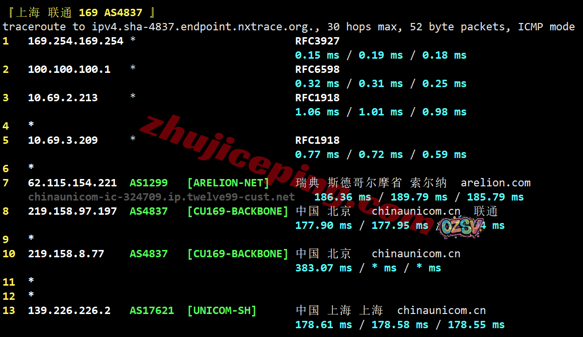 上海方向:内网出来直接去了瑞典,从联通退佃索尔纳peer/telia出海回国